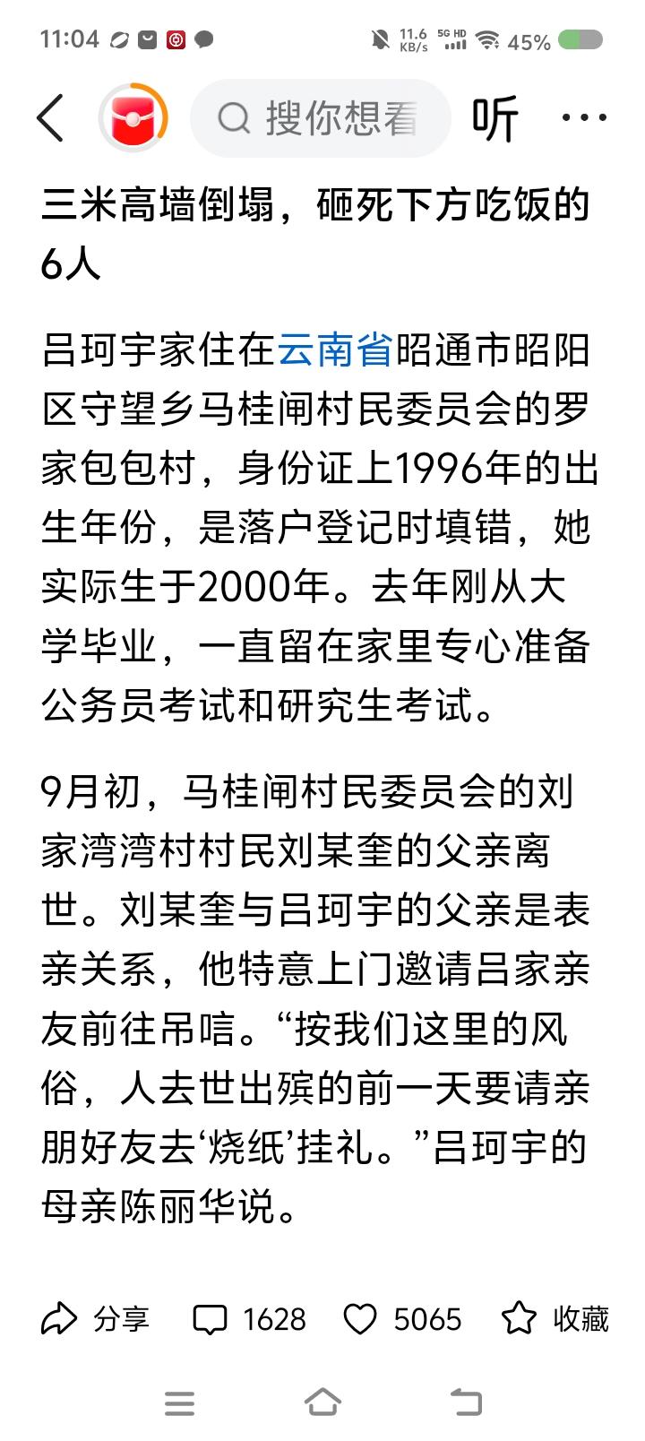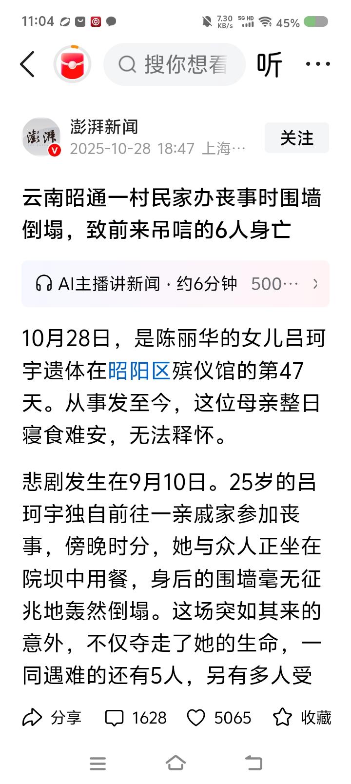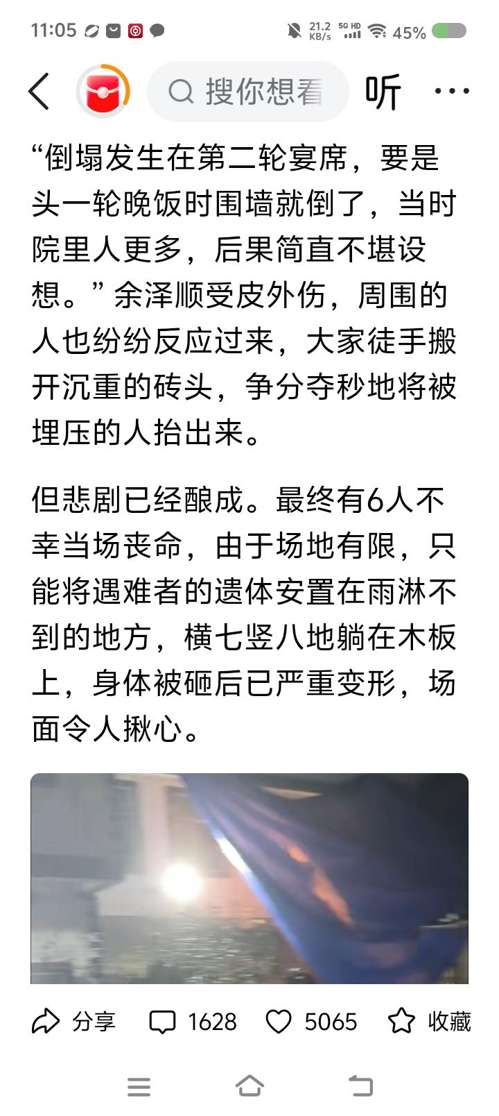 丧事遇上“丧事”?—— 据报道,云南某地一村民家办丧事,围墙倒塌,6人遇难。有关部门筹款,加上事主赔偿,共14.6万元,给到每一家,前提是遗体尽快火化,其中一名死者家属不同意,要求查明具体原因,予以公布。 点评: 这种事故听着罕见又常见。农村设施和人的管理,加上自然因素,会导致的。 曾去过有丧事的人家,有的屋旧巷窄院子小,不具备宴席请客的安全条件。 希望农村干部加强农村旧屋危墙的调查。