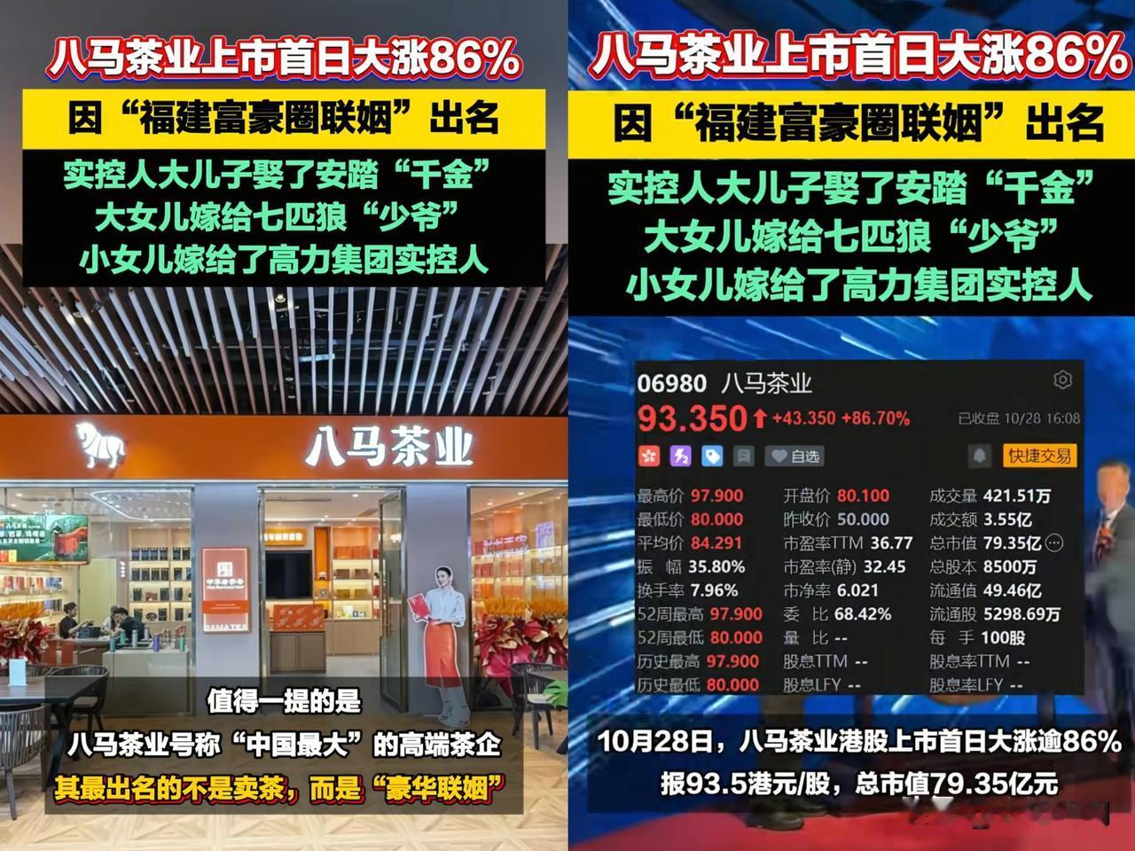 泉州富豪圈 这操作太绝了! 八马茶业闯了12年IPO, 12年四次失败,谁能想到,最后竟靠儿女婚事凑齐500亿“护航团”。 老板王文彬的儿子娶了安踏丁世忠千金,大女儿嫁给七匹狼实控人儿子,小女儿联姻高力控股继承人。这一下子,三大巨头成“自家人”,光亲家身家就超500亿。七匹狼直接持股八马3%,安踏也采购其茶叶。之前拼财报进不了资本市场,如今靠联姻织就资本网,第五次上市终成功。 不得不说,商业联姻有时真能创造奇迹。但这背后,是家族企业的智慧谋略,还是另有隐情?大家怎么看这种靠联姻助力企业上市的操作呢?