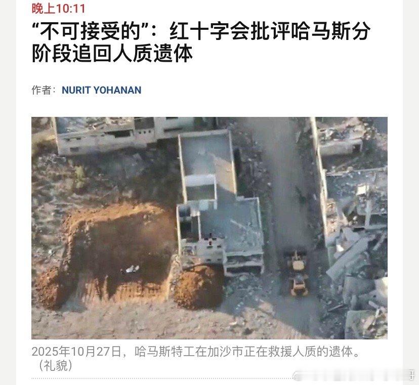 不只是以色列抨击哈马斯,国际红十字会也指责哈马斯不按协议执行。特别是以色列公开一段无人机视频,显示哈马斯把藏匿的人质遗体搬出来,先埋在土里,然后故意叫来红十字会的人,说发现了新遗体。这让红十字会也感到很恼火。以色列总理下令强力打击加沙