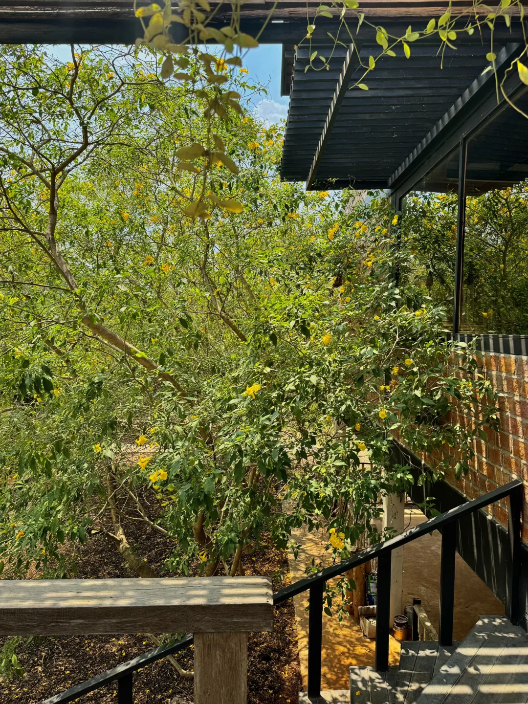 坐在小院子里吃芒果抬眼就是绿油油的果树