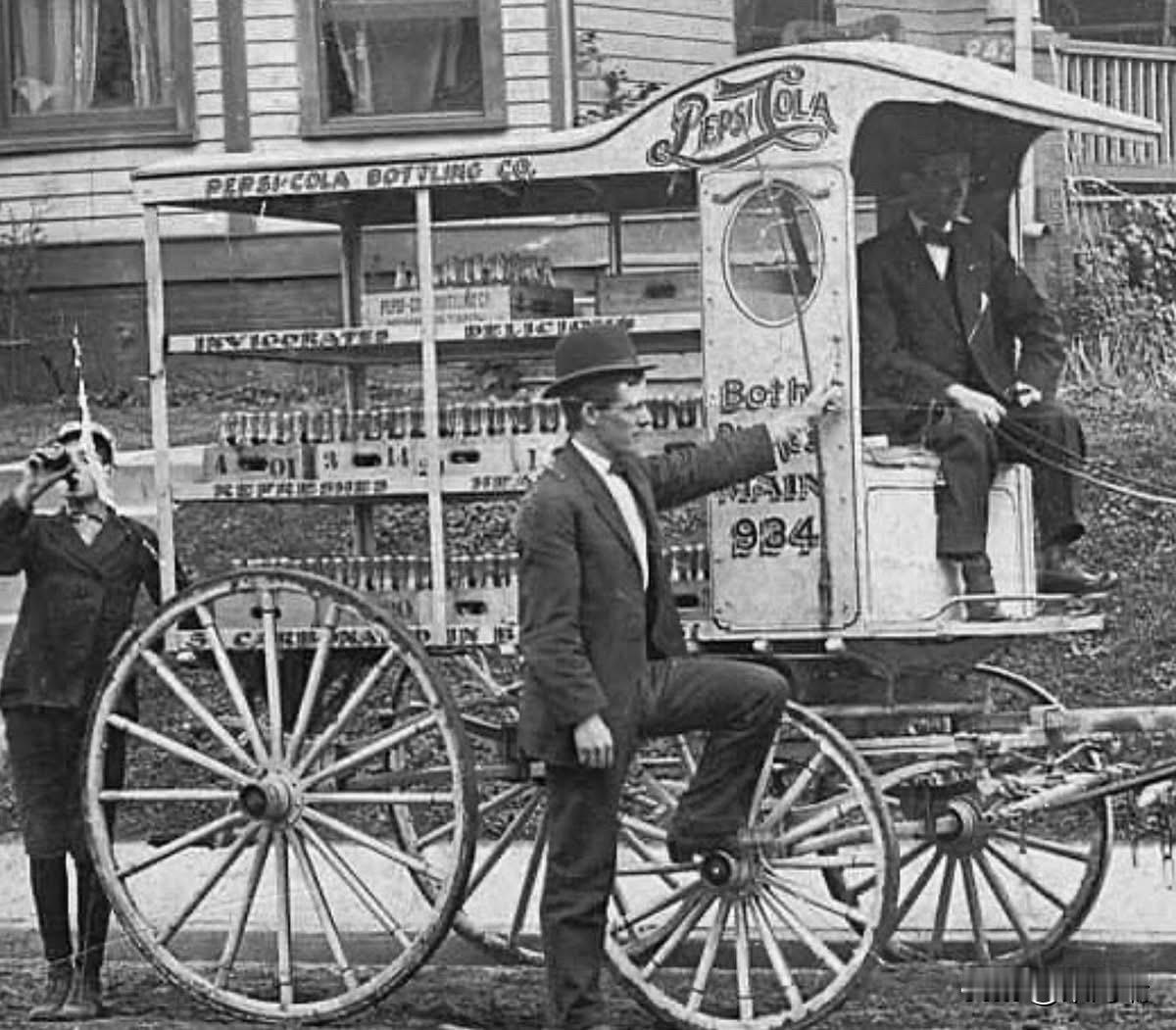 这张照片展示的是一张百事可乐公司的老照片。照片中是一辆百事可乐的送货马车,车上印有「PEPSI-COLA BOTTLING CO.」和「PEPSI OLA」的字样,照片拍摄时间是1910年,展示了当时在纽约街头运送百事可乐的马车。这张照片是百事可乐早期历史的一部分,百事可乐最初由药剂师迦勒·布拉德汉姆于1893年发明,当时名为「布拉德饮料」(Brad's Drink),并于1898年改名为「百事可乐」。