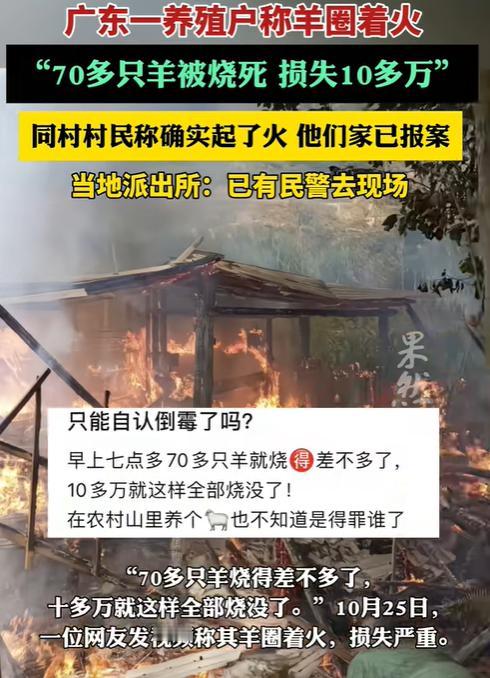 近日,广东韶关,一男子在山上养羊,结果早上去喂羊的时候发现羊圈着火,60多只羊被活活烧死,羊舍也被烧毁,损失了10多万元!由于山上没通电,所以没安监控,不知道起火的原因。网友:这是有人眼红了! “六十多只羊啊,一把火全没了!不知道是天灾还是人祸?”2025年10月25日,养殖户老陈(化名)像往常一样早起上山喂羊。远远就看见羊圈方向冒着黑烟,等他赶到后,空气中弥漫着皮毛烧焦的刺鼻气味,那些每天早上都会“咩咩”叫着迎接他的羊群,此刻已变成一地焦尸。 当初,老陈就是看中了凌溪村后山这片荒地。这里植被茂盛,又靠近水源,虽然没通电线,但正是养羊的好地方。他拿出打工多年的积蓄,又向亲戚借了些钱,这才建起羊圈,买来一些种羊。 “山上养羊辛苦,但自由。”老陈经常对朋友这么说。每天一大早,他就起床割草、喂羊、清理羊圈,羊群这才慢慢发展到现在的六七十只。谁也没想到,一场大火烧毁了一切,他一下子损失了10多万。 目前,警方表示,具体损失数量还在统计中,起火原因也待进一步调查。而正是因为山上没安监控,村民们对此议论纷纷。 有人猜测是有人眼红老陈的成功:“去年他也赚了钱,在村里太招摇了。”也有人认为是老陈自己用火不慎:“他常在羊圈边抽烟,可能是烟头没熄灭。”还有人说是干燥天气引发的自燃。 每一种猜测背后,都折射出农村养殖业面临的现实困境。 在韶关的农村地区,像老陈这样选择在山里搞养殖的农户不在少数。地势偏远、缺乏基础设施是他们共同面临的难题。 “我们也想装监控,但没电怎么办?”另一位养殖户坦言,“用太阳能板价格太贵,我们小本经营负担不起。” 事实上,韶关市官方在9月底已发布预警,指出第四季度当地气候干燥,森林火险等级高。然而,这样的预警往往难以传达到每一个深山中的养殖户。 更令人担忧的是,农村养殖户普遍缺乏风险防范意识和措施。绝大多数散户养殖既没有购买保险,也没有配备基本的消防设备。一旦发生意外,多年的心血可能瞬间付诸一炬。 “我们总觉得火灾这种事不会轮到自己头上。”一位养殖户说,“这次老陈家出事,大家都警惕起来了。” 老陈的遭遇并非孤例,在全国各地的农村,类似的悲剧时有发生。而每一次事故背后,都可能是一个家庭的巨大损失。 只能说,这件事也给农村养殖户提了个醒,天干物燥,防火真不是闹着玩的。所以啊,该配灭火器的别省那几十块,能用太阳能的尽量装上。日子总要往前过,羊没了还能再养,只要人没事,总有翻身的时候。 信源: 齐鲁晚报·果然视频——广东韶关--羊圈着火,养殖户称数十只羊被烧死 文│一阳 编辑│史叔