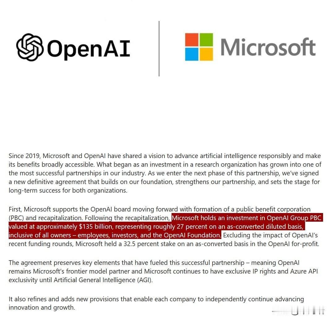 最新消息:微软目前拥有 OpenAI 27% 的股份,价值 1350 亿美元。 根据最新的协议,微软目前持有OpenAI集团公共利益公司(OpenAI Group PBC)约27%的股份,价值约为1350亿美元。 该协议是微软与OpenAI进入下一阶段合作后签署的新协议,巩固了双方的合作关系。 新协议中的一些关键点包括: 股份持有: 微软持有的投资权益估值约为1350亿美元,约占稀释后转换股份的27%。 合作关系: OpenAI仍将是微软的前沿模型合作伙伴,微软将继续拥有独占的IP权利和Azure API独家使用权,直至通用人工智能(AGI)实现。 服务购买: 作为协议的一部分,OpenAI承诺将额外投入2500亿美元用于购买Azure服务。 独立发展: 协议还增加了新的条款,使两家公司能够独立地继续推进创新和增长。