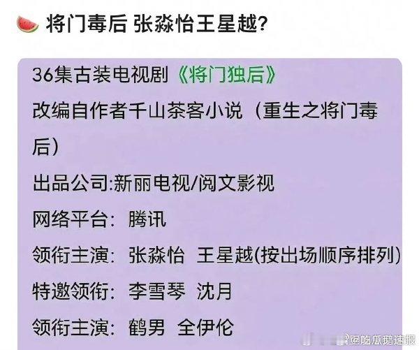 疑似张淼怡和王星越将合作出演《将门毒后》,网传消息让这部作品提前进入大众视野,两人的角色搭配成为关注焦点。网传张淼怡王星越出演将门毒后疑似张淼怡王星越合作
