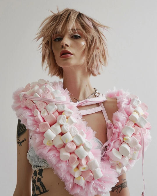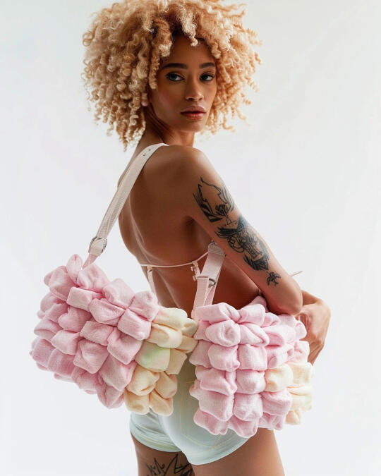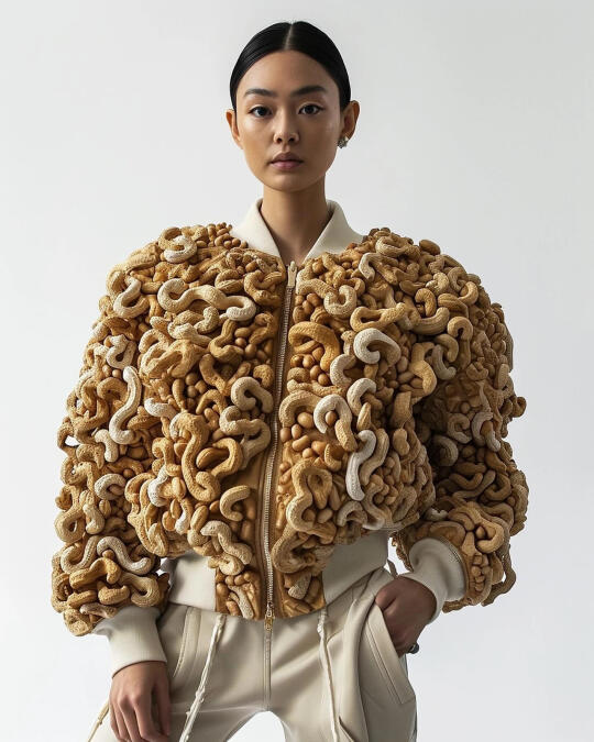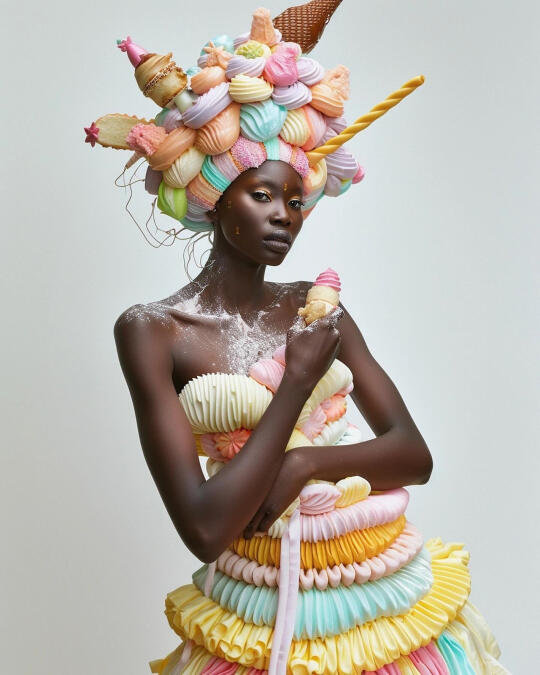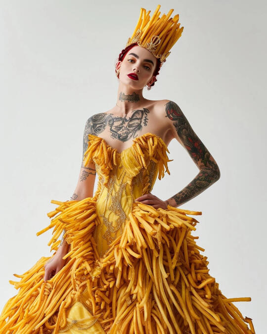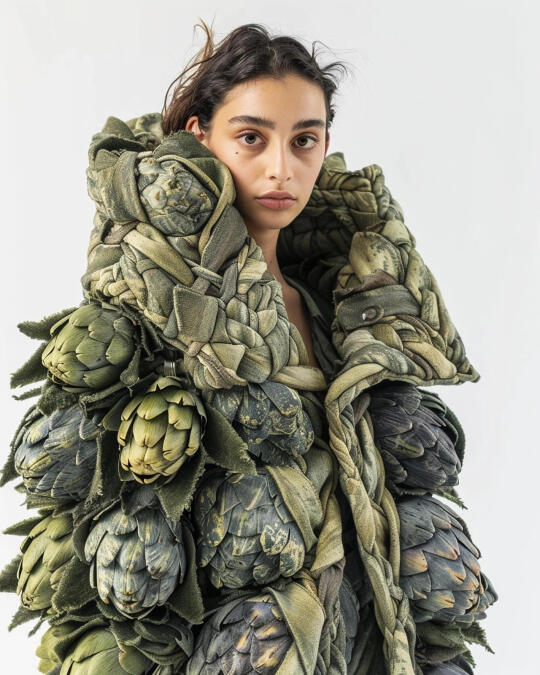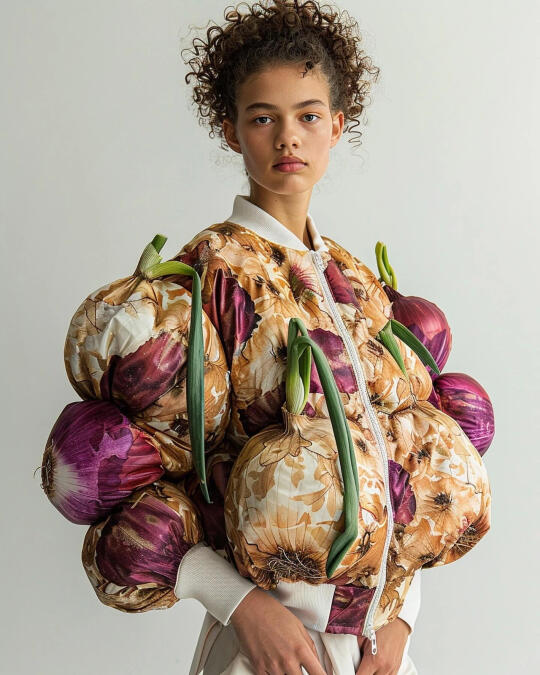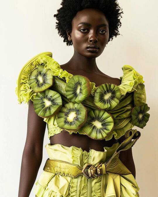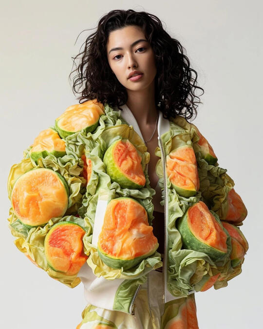 在邦尼·卡雷拉的人工智能绘画作品中,我们可以看到大量蔬菜、水果和植物打造的时尚服饰,邦尼·卡雷拉利用人工智能绘画的执行力,将食物与时尚结合到一起,一件件异想天开的时尚服饰,以及时尚单品就此诞生,让人感到十分有趣。 你能想象到,美女模特将榴莲、冰激凌、薯条、洋葱和寿司等食物,穿到身上之后会是什么效果吗?如果你也好奇,那么接下来,就让我们一起来欣赏一下这组独特的人工智能绘画作品吧。