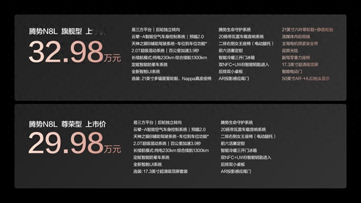 29.98-32.98万元的大六座安全豪华腾势N8L 如果要用三点做个总结,就是:超安全家庭大六座、超豪华移动大平层、超智能科技大座驾。