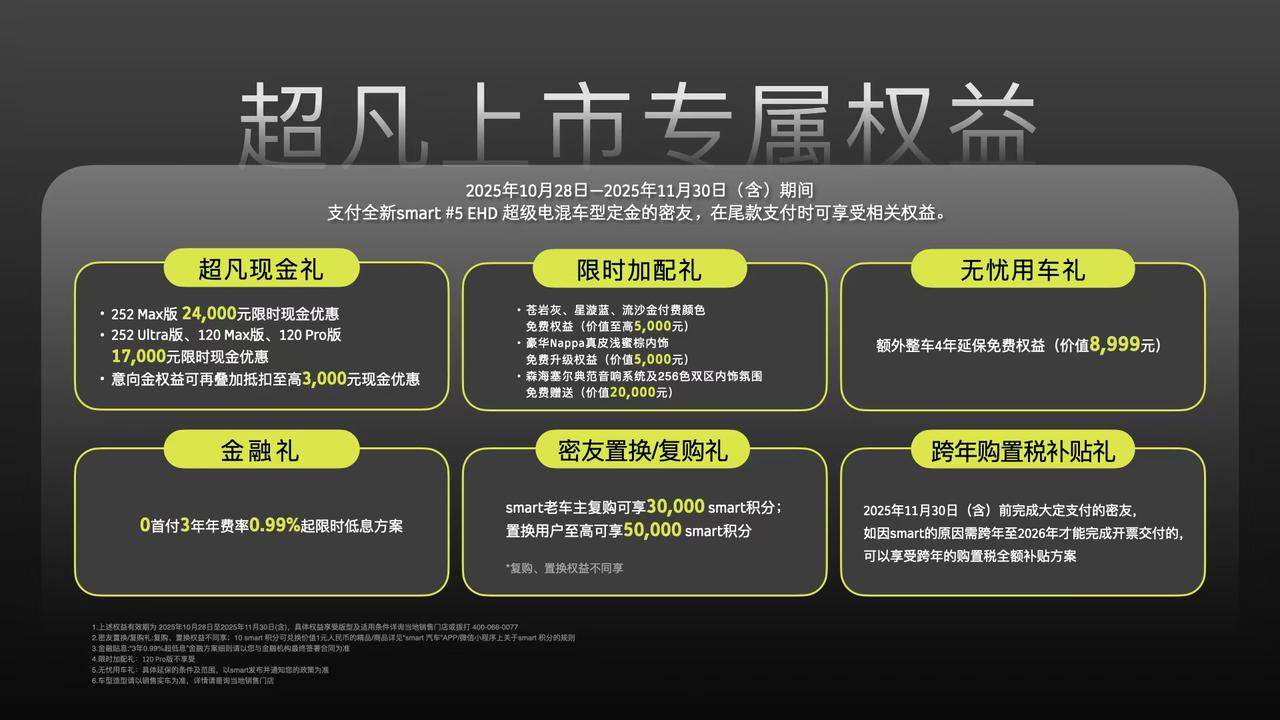 smart精灵5号EHD上市,售价18.99万元-23.99万元,2025年11月30日前可享限时售价16.99万元-21.99万元。新车搭载1.5T插混系统,综合最大功率320kW,峰值扭矩635N·m,CLTC纯电续航有120km和252km两个版本,CLTC综合续航分别为1483km和1615km。