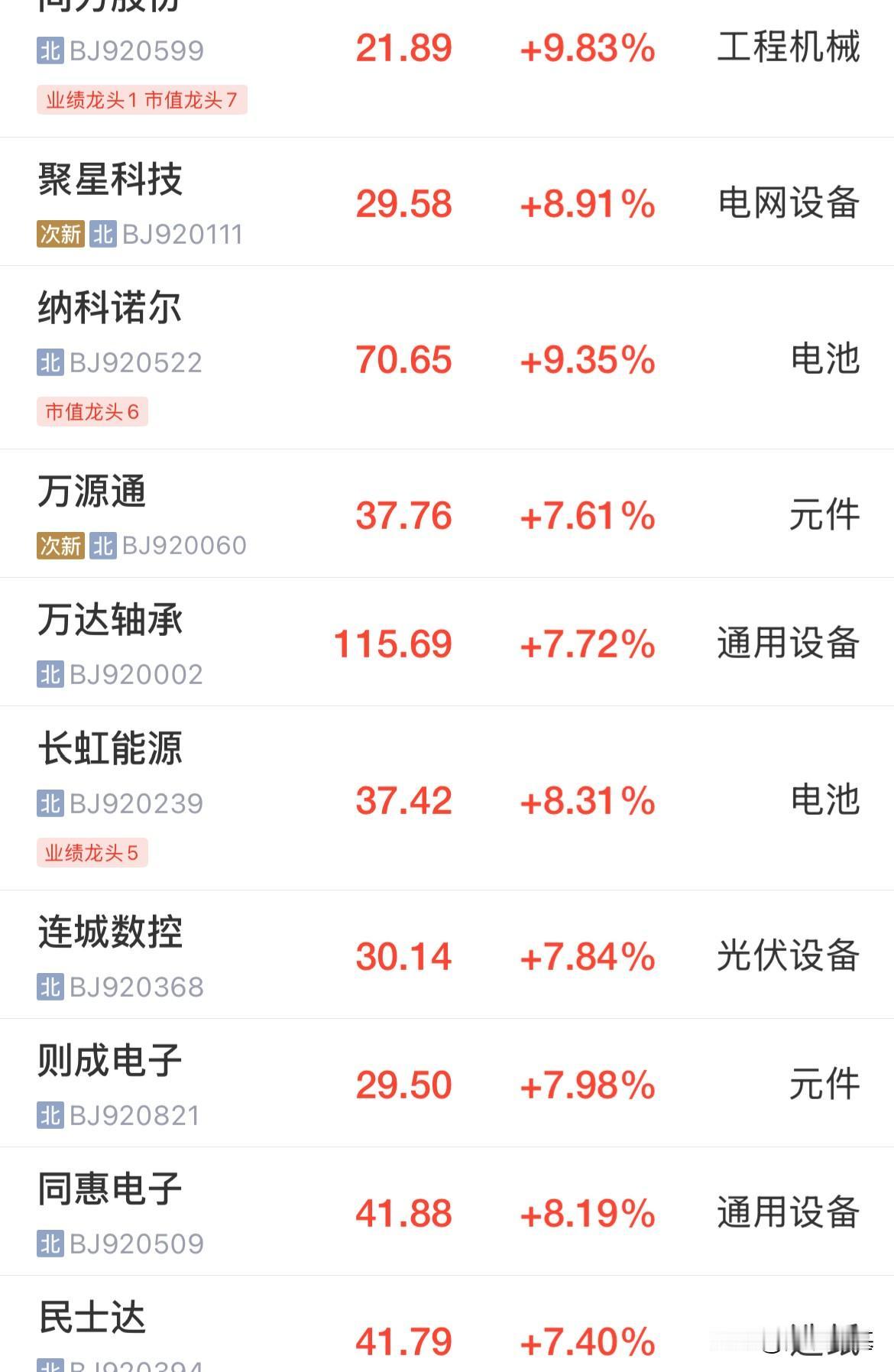 北证大涨8%了,北交所所有股票都上涨了,集体狂欢啊,憋了两个月了,终于要放大招了 成分股普涨,都是涨幅3%以上,涨幅2%的都只能垫底, 最高的华信永道涨幅超24%,最低国航远洋涨幅2.96%, 涨幅没到3%的都是去小孩那桌了。