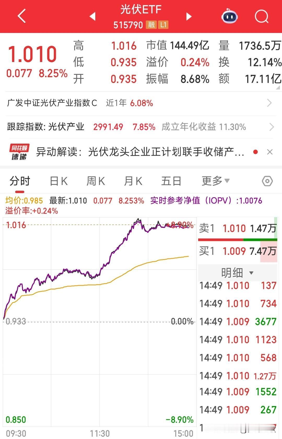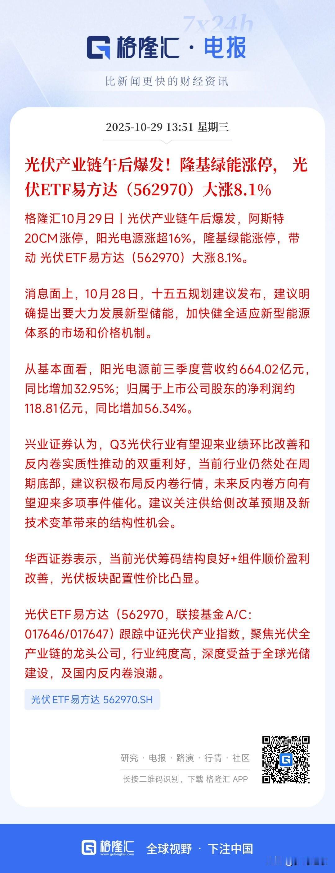 光伏终于开始爆发了,两大利好促使光伏产业稳步向好 今天光伏板块彻底的爆发了,ETF涨了超8%,也就是说光伏板块大部分的个股都涨了8%以上,这是光伏下跌以来涨幅最大的一次,也预示着光伏的反转周期要来了。 消息面上两大利好 1.十五五规划利好光伏,会大力发展储能设备,这给了光伏行业的想象空间 2.光伏行业自从“反内卷”后就出现了很大的业绩提升,三季度报普遍盈利。预计四季度也差不了。 光伏的大涨对于下跌了两年的新能源来说是一个反转的契机,就看今年年报了。
