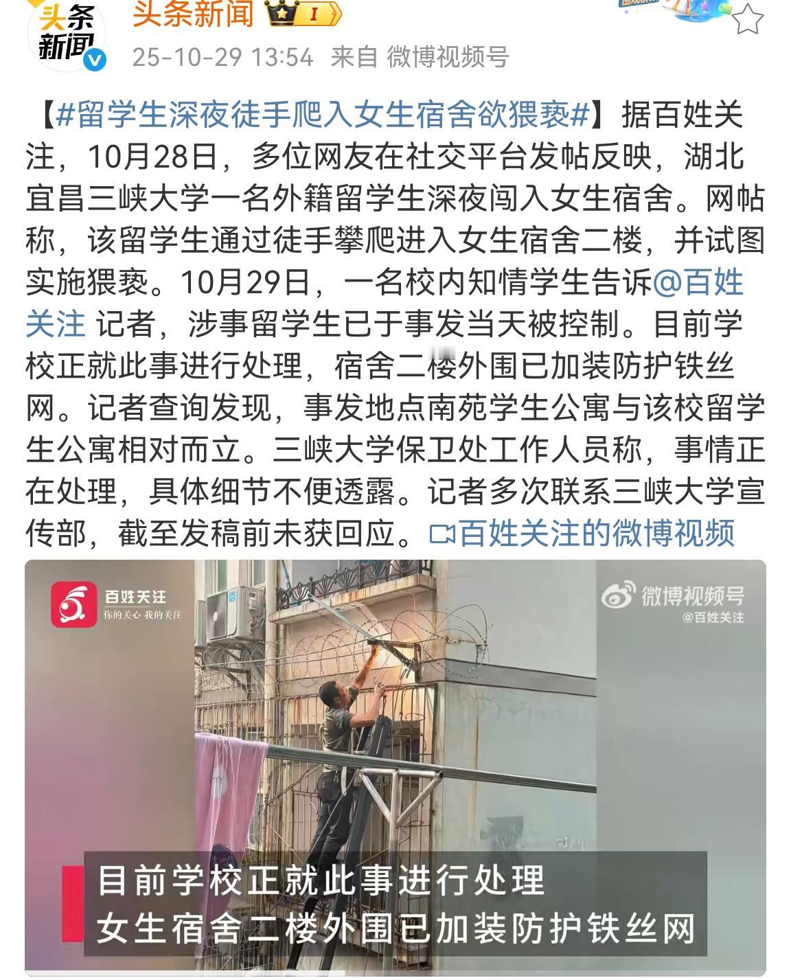 全网愤怒, 外籍留学生深夜闯女生宿舍大肆猥亵。 昨天深夜该外国人徒手爬上二楼大学女生宿舍,猥亵宿舍里的女学生。 幸亏女学生拼命反抗,大声呼救,才侥幸获救,没进一步发展为更可怕的事情。 该留学生虽已被控制,学校暂时没透露处理结果。 但全网的怒火不会熄灭,记者又多次电话联系,证实以被警方刑拘。 引进外籍学生的门槛是低是高,大家心里都很清楚。 只是谁请来的“大爷”,请谁带回自己的家。 别来祸害老百姓的孩子。