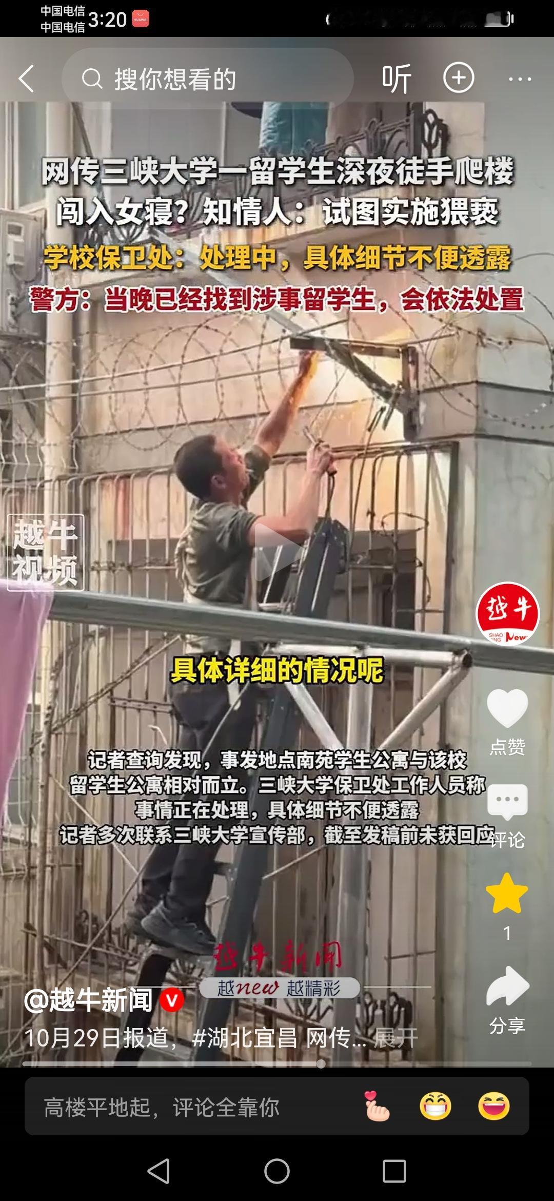 三峡大学的官方通报正式出来了! 证实了10月28号深夜,有一个外籍留学生爬上了女生宿舍的二楼,并且闯入宿舍里面,对其中一名女学生发生了猥亵的行为。 大家一直担心的问题终于还是发生了啊。此前就有不少人表示,有些过来我们这里留学的外籍学生,本来的参差不齐,需要严加管教。事实也证明大家的担心是应该得到重视的。 涉事外籍留学生目前已经被警方刑事拘留,三峡大学也通报直接开除学籍,可以说处理的也是非常的及时了!