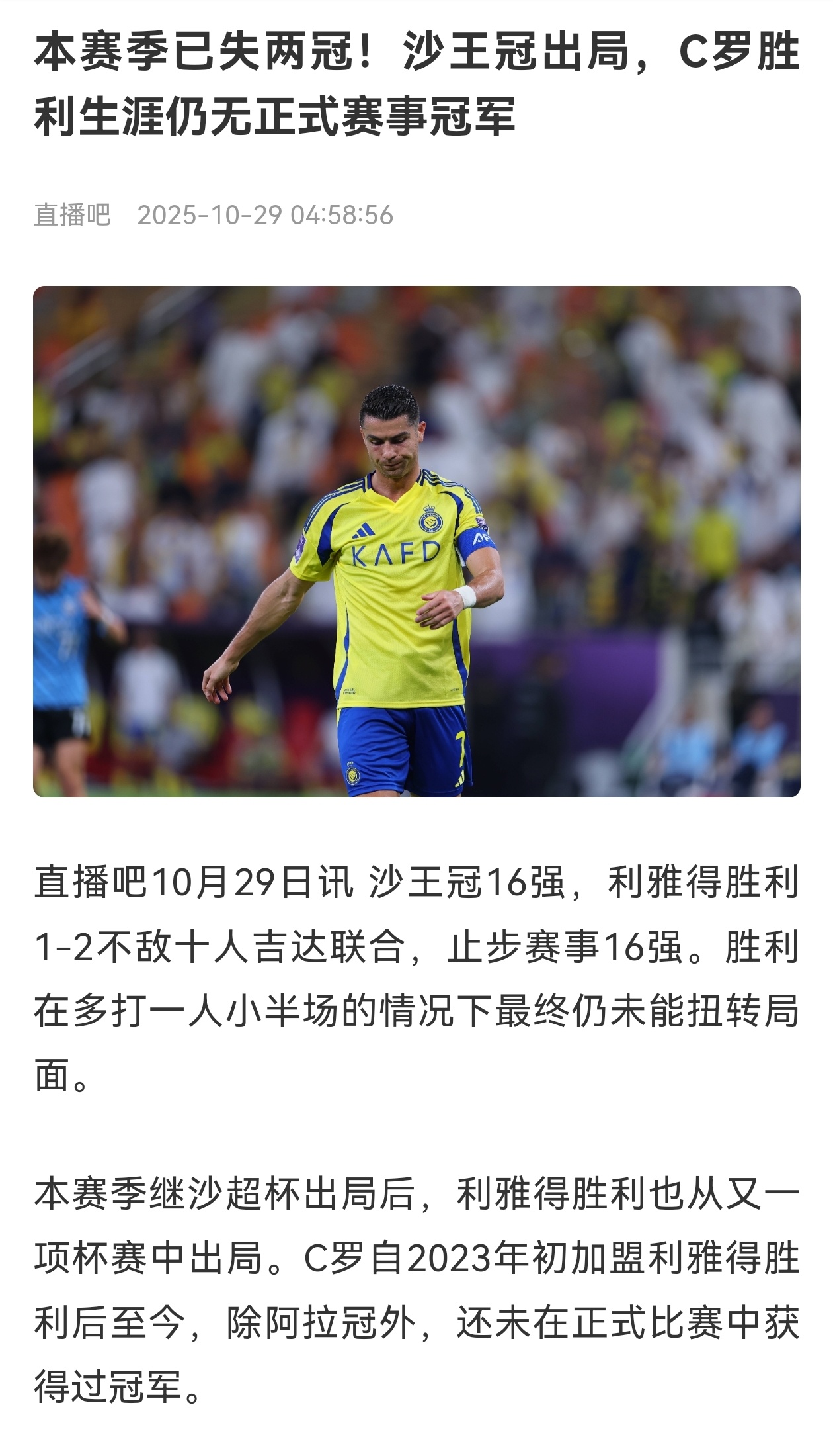 💥利雅得胜利1比2吉达联合利雅得胜利止步沙王冠16强,罗哥赛季“痛失”第二冠!