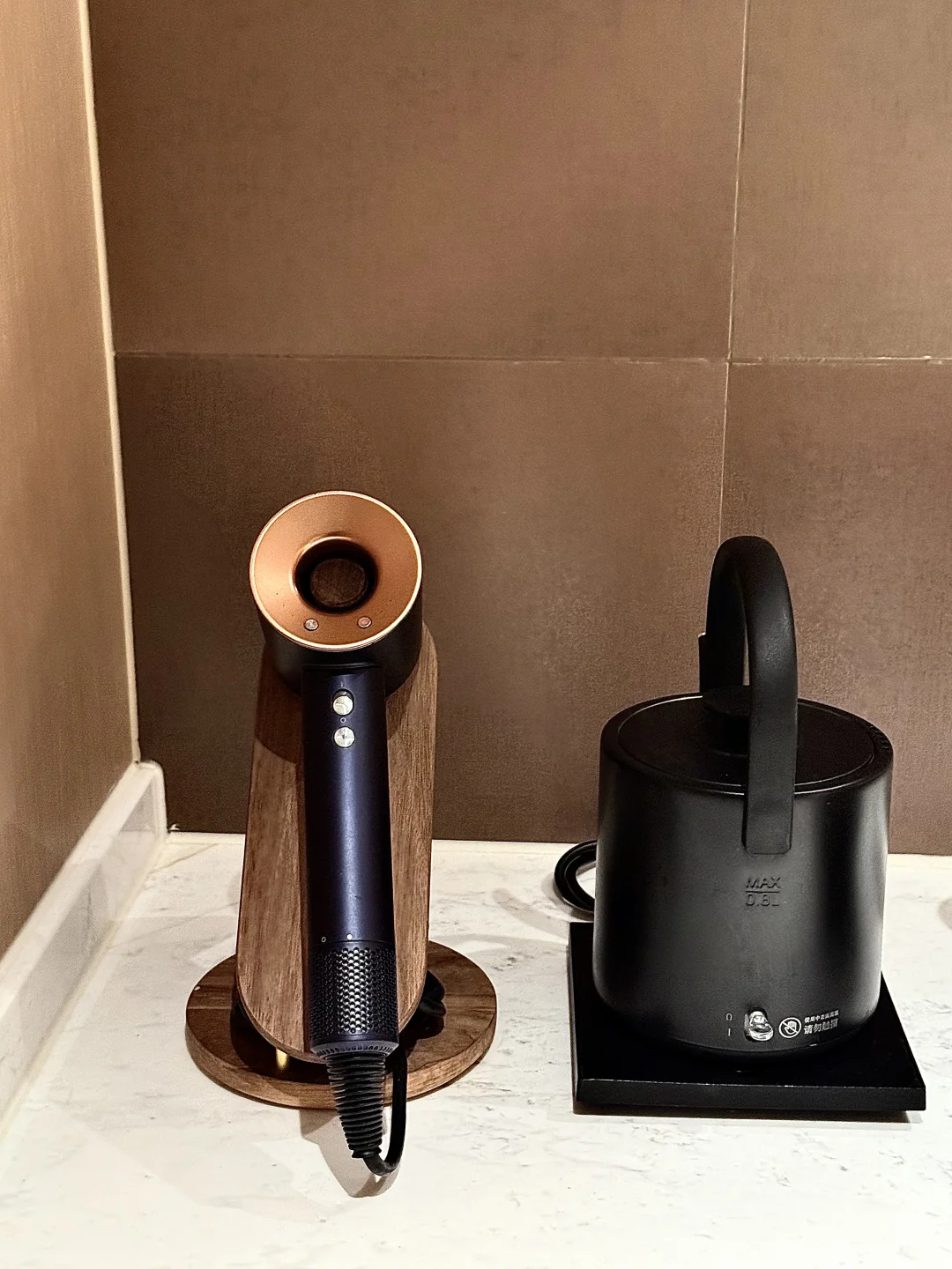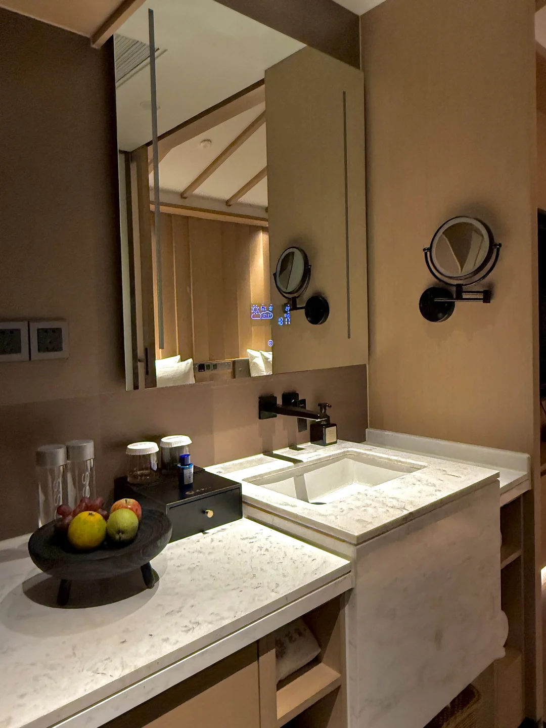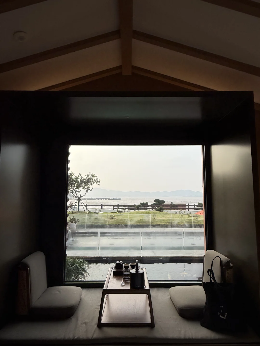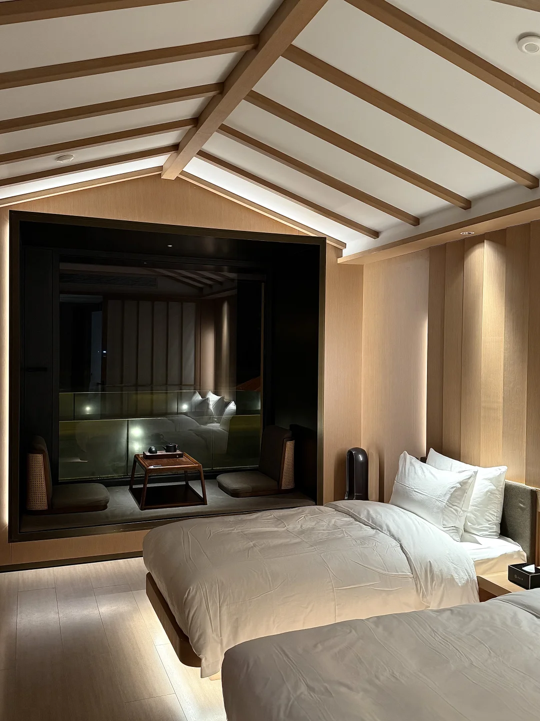 园林设计也花了心思,翠竹掩映,石径通幽。门口的锦鲤池中,数十尾红鲤悠然游弋,更添静谧与禅意。房间天然竹材的运用营造出清新通透感。全套汉斯格雅卫浴和戴森吹风机,帕尔玛之水。全屋小度智能调控舒适度Max!!最令人惊喜的是,从房间窗户便能望见南海观音大佛,早上日出在观音菩萨身后升起 ,大光明的即视感,很震撼🙏