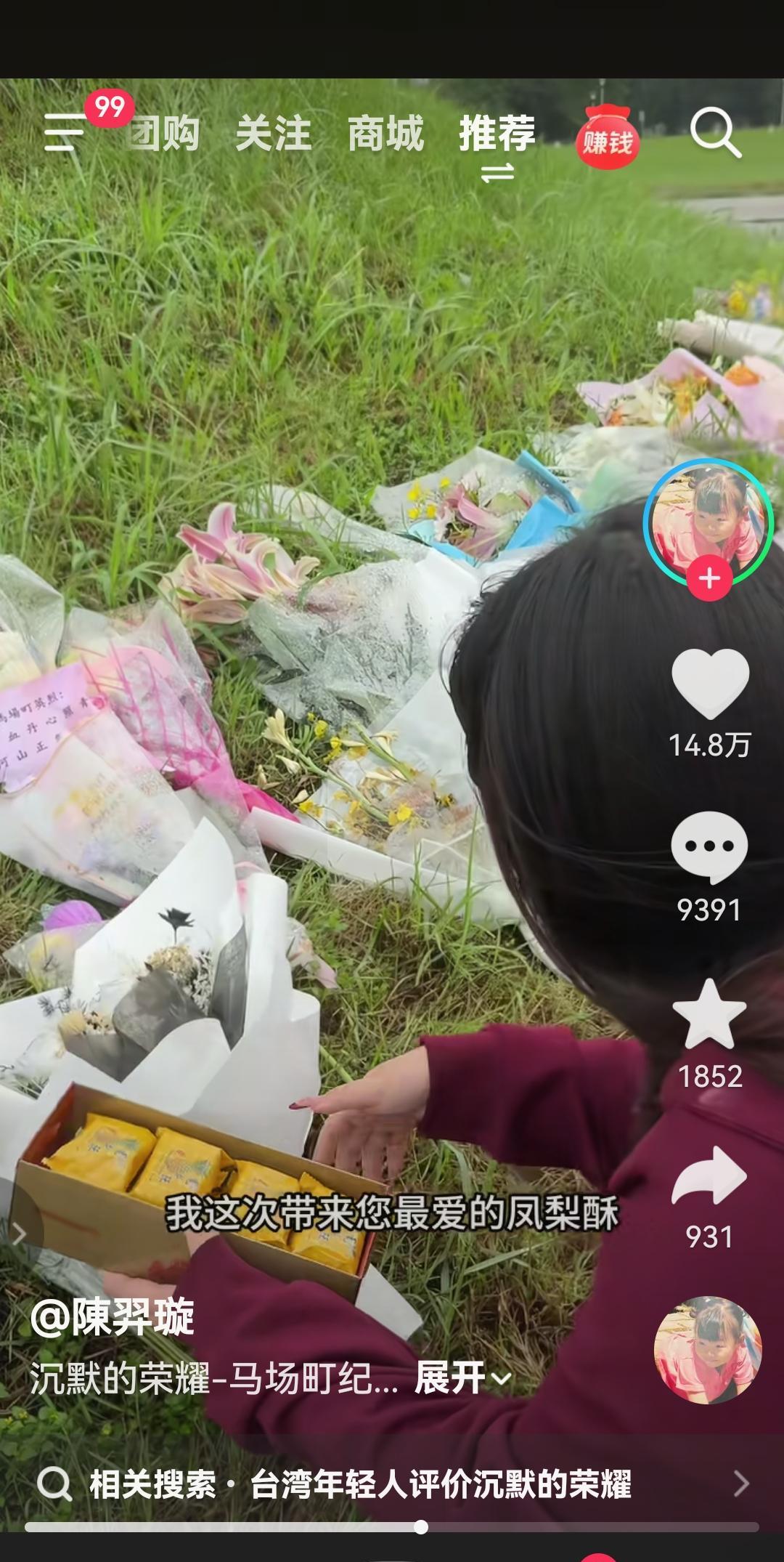 非常喜欢陈羿璇这个台湾小妹妹。今天看她抖音,带闺蜜一起去马场町祭拜吴石将军,还带了吴石将军喜欢吃的凤梨酥正如羿璇小妹妹说的,沉默的荣耀上半场己结束,下半场将由我们十四亿人民来完成。为台湾的小女孩点赞。#陈羿璇#