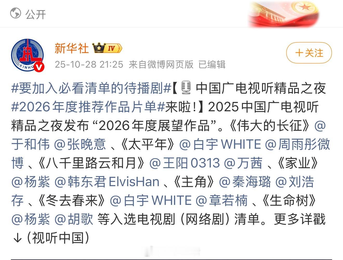 新华社发布的要加入2026必看清单的待播剧,杨紫两部待播剧家业、生命树均上榜。[赞]