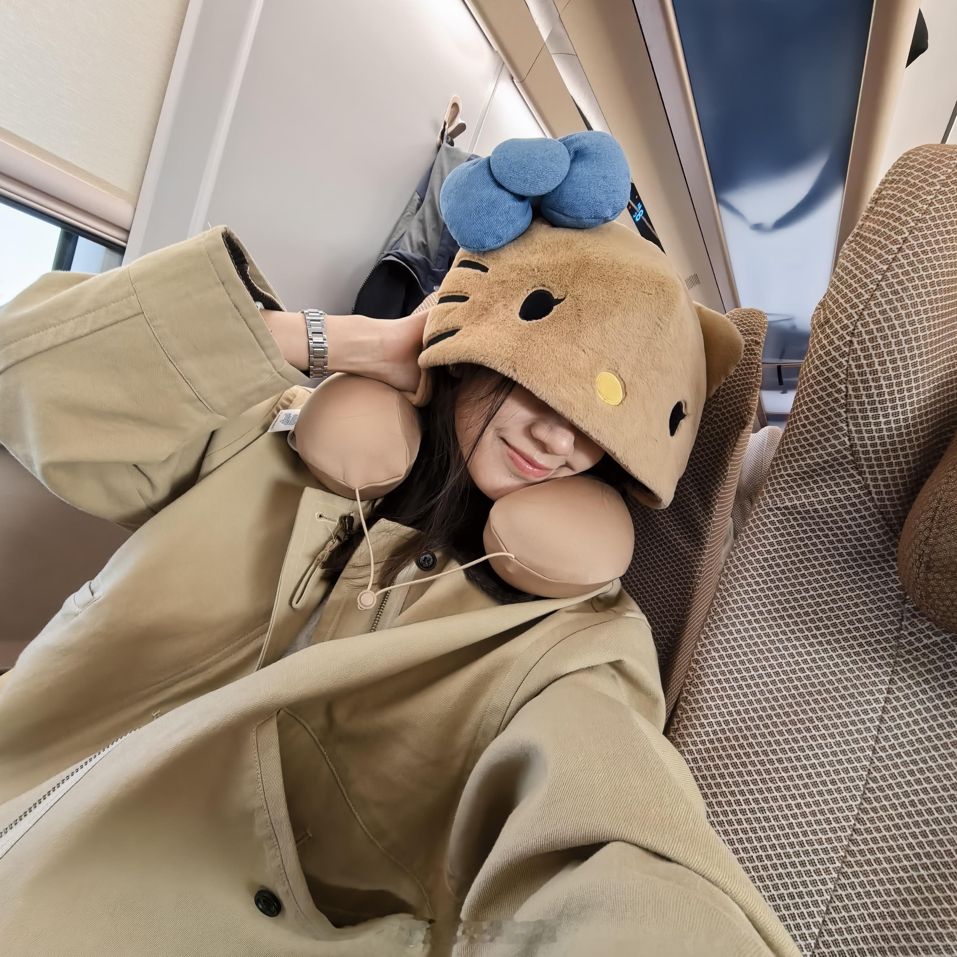 今天要坐4小时高铁回南京团队弟弟送了我一个颈枕套装 特好使 帽子一戴就是睡还不怕