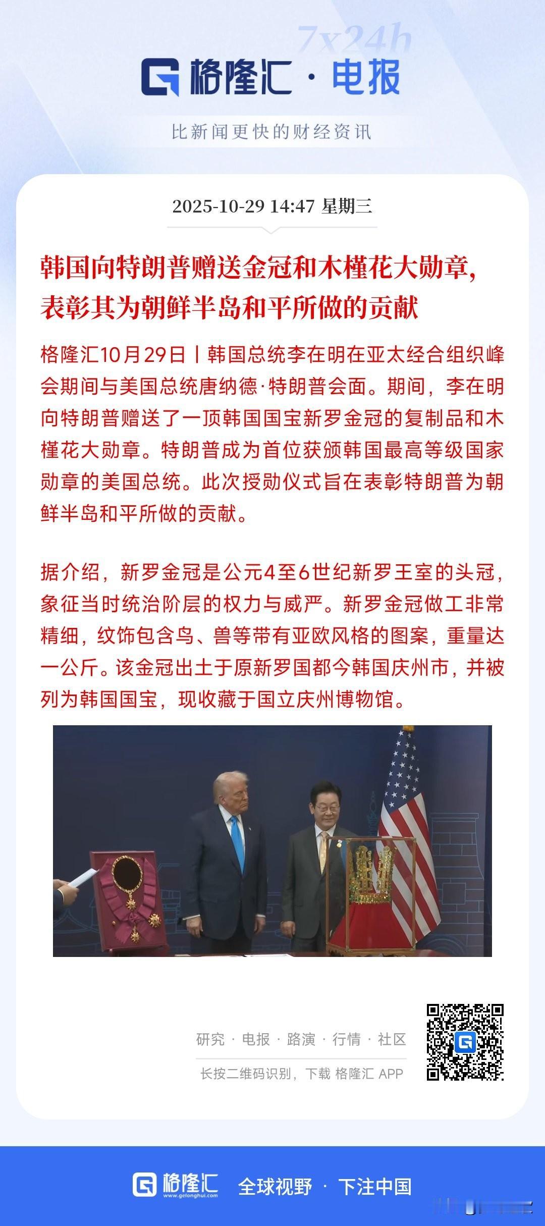 特朗普访问一圈下来真是收获颇丰,不止赢得投资还得到了金冠 在日本访问的时候,特朗普就得到了日本赠送的前领导人的礼物,以表示日本和美国友好的象征,并且得到了日本承诺5500亿美元的投资,这让特朗普这趟日本之行圆满结束。 到了韩国更是得到了国宝金冠的复制品,现在还没有公布将对美国进行投资多少美元,但关税谈判的时候韩国承诺了3500亿美元的投资。特朗普这次来访问韩国最主要的目的也是这事。