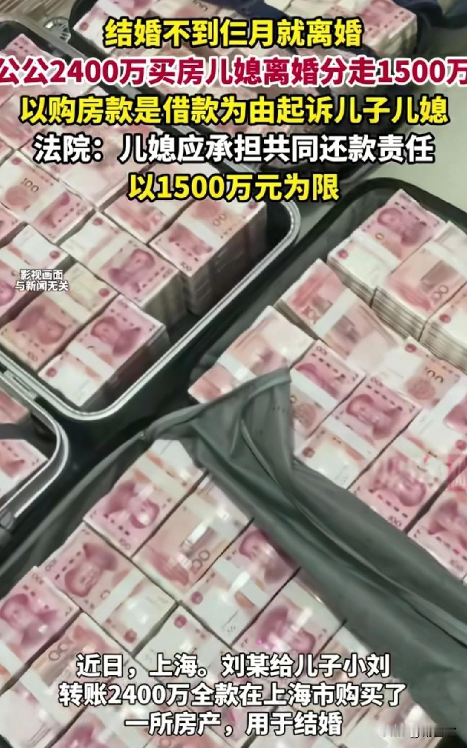果然姜还是老的辣呀! 刷到上海这位老爸才是真的人间清醒!婚前掏2400万给儿子买婚房,结果刚结 婚73天,女方就提离婚还想分1500万,换别人可能只能吃哑巴亏, 他直接甩出儿子写的借条去起诉, 最后法院判女方得一起还这笔钱! 别骂这老爸算计, 他根本不是防儿媳, 是把丑话说在前面, 护好自己的养老钱! 好多父母总觉得谈钱伤感情, 把一辈子积蓄砸进去连个凭证都没有,最后婚没了钱也没了,哭都没地儿哭。 其实提前写清楚钱的事儿,不是见外,是给亲情和婚姻都上了保险。 法律也站理:钱用在婚后生活, 受益人就得担责, 这判决既没让老实人吃亏, 也戳破了那些想靠结婚捞钱的小心思。 你身边有没有这种“把账算明白”的长辈?要是你爸妈帮你买房,会提前说清这些事吗?