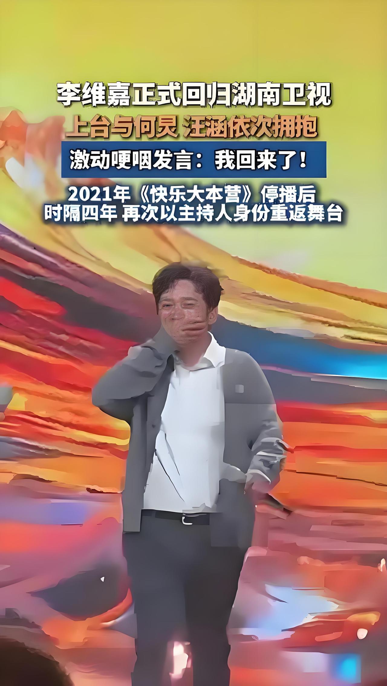 2025年10月28日,湖南卫视秋季招商大会上,李维嘉正式回归,与何炅、汪涵拥抱落泪,发言时数次哽咽。他感慨“在外面漂泊这么久,日子不好过,今天回到这里找到了家的感觉”。此前,他已以主持人身份亮相《再见爱人》第五季,迈出回归第一步。李维嘉谢娜 汪涵 李维嘉 何炅厌食症