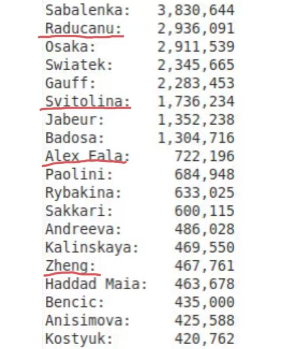 ins上粉丝最多的女子网球运动员top20榜单 萨巴伦卡第一,斯瓦泰克第四,高芙第五,郑钦文以46万+的粉丝数量排名第15。 让人意想不到的是,拉杜卡努居然排名第2,斯维托丽娜、伊艾拉的排名也排在郑钦文的前面。这几位成绩不咋地,所在国籍也是弹丸小国,怎么在ins上的粉丝怎么会比郑钦文还多呢?
