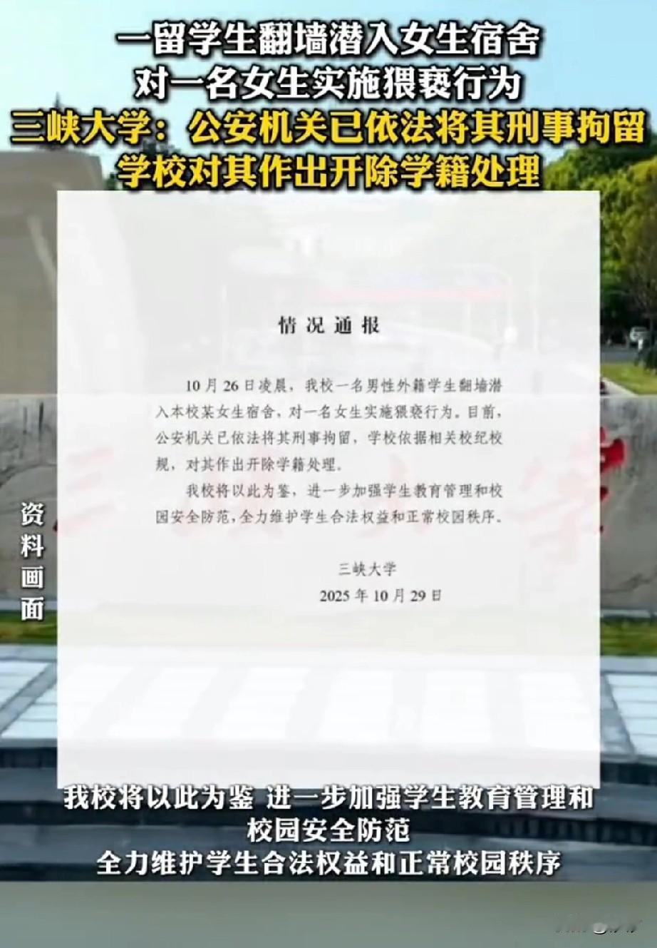 现在国内留学生已经真的勇敢了吗? 10月25日湖北某峡大学一外国留学生, 深夜徒手攀爬至女生宿舍楼二楼, 企图猥亵一名女同学, 女生奋力反抗大声呼救才没有让其得逞,外籍留学生看已经暴露就逃跑了, 还真是目无法纪, 涉事女生已经报警, 学校表示事情都发生了, 没什么好说的, 外籍留学生已经被刑事拘留了, 学校也加强了女生宿舍的巡逻, 并在女生宿舍外围加装了铁丝网, 这就是学校的应对方案, 难道不应该召集本校留学生, 给他们上上了,警示一番吗? 为啥就单单发了一个公告, 开除这个留学生的学籍就完事了, 我们自己的女学生都保护不了, 这学校也太敷衍了! 在我们的大学校园居然要靠铁丝网保护女生宿舍楼的安全简直是笑话, 招聘这个留学生的相关人员难道不应该追责吗?什么人都可以进去中国重点大学留学,拿着高额的补贴, 惦记着国内拼了命考进去的女学生, 这未免太让人心寒了! 一定要严惩这名犯罪的留学生! 大家对于湖北某峡大学留学生深夜翻墙进入女生宿舍猥亵女大学生怎么看? 三峡大学 为什么引进非洲留学生留学生那点事 留学生 大学留学生困境