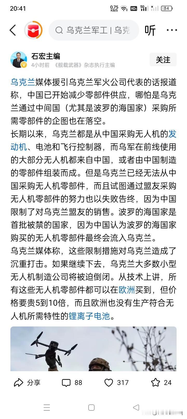 真想不到! 网络上有文说,以前乌克兰生产的无人机的零部件,基本上都是购买自我们,或由其盟友代为向我们购买,这些零部件主要是发动机、电池和飞行控制器。 怪不得西方国家在高科技产品方面大力压制我们,原来一直以为西方、尤其是欧洲国家的科学技术很先进,结果竟然连个无人机的发动机、电池和飞行控制器都制造不出来。 据网络上的消息说,现在我们已经停止向乌克兰和它的盟国出口无人机零部件,那么乌克兰无人机的生产量不是要大大减少吗!而无人机又是乌克兰在与俄罗斯的战争中最主要的作战武器,这是否就意味着乌克兰在这场战争中就有可能必败无疑呢?