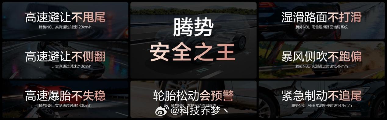 腾势N8L 安全更是强无敌,128km/h高速避让不甩尾、210km/h高速避让(鱼钩测试)不侧翻、180km/h高速爆胎不失稳、154km/h暴风侧吹不跑偏、147km/h AEB自动紧急制动,时刻为安全行驶保驾护航。