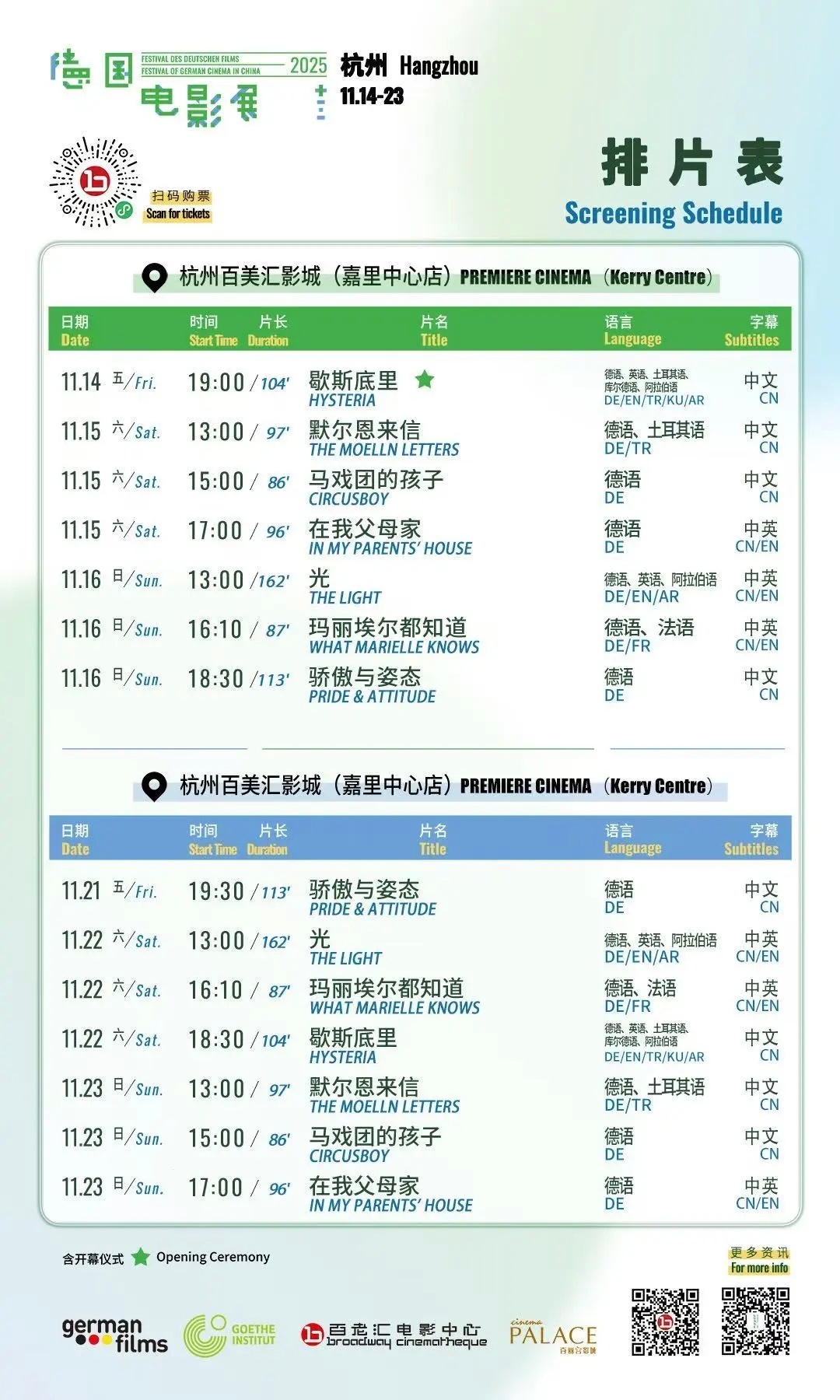 影展2025德国电影展·杭州站排片表公布,10月30日(周四)中午12:00
