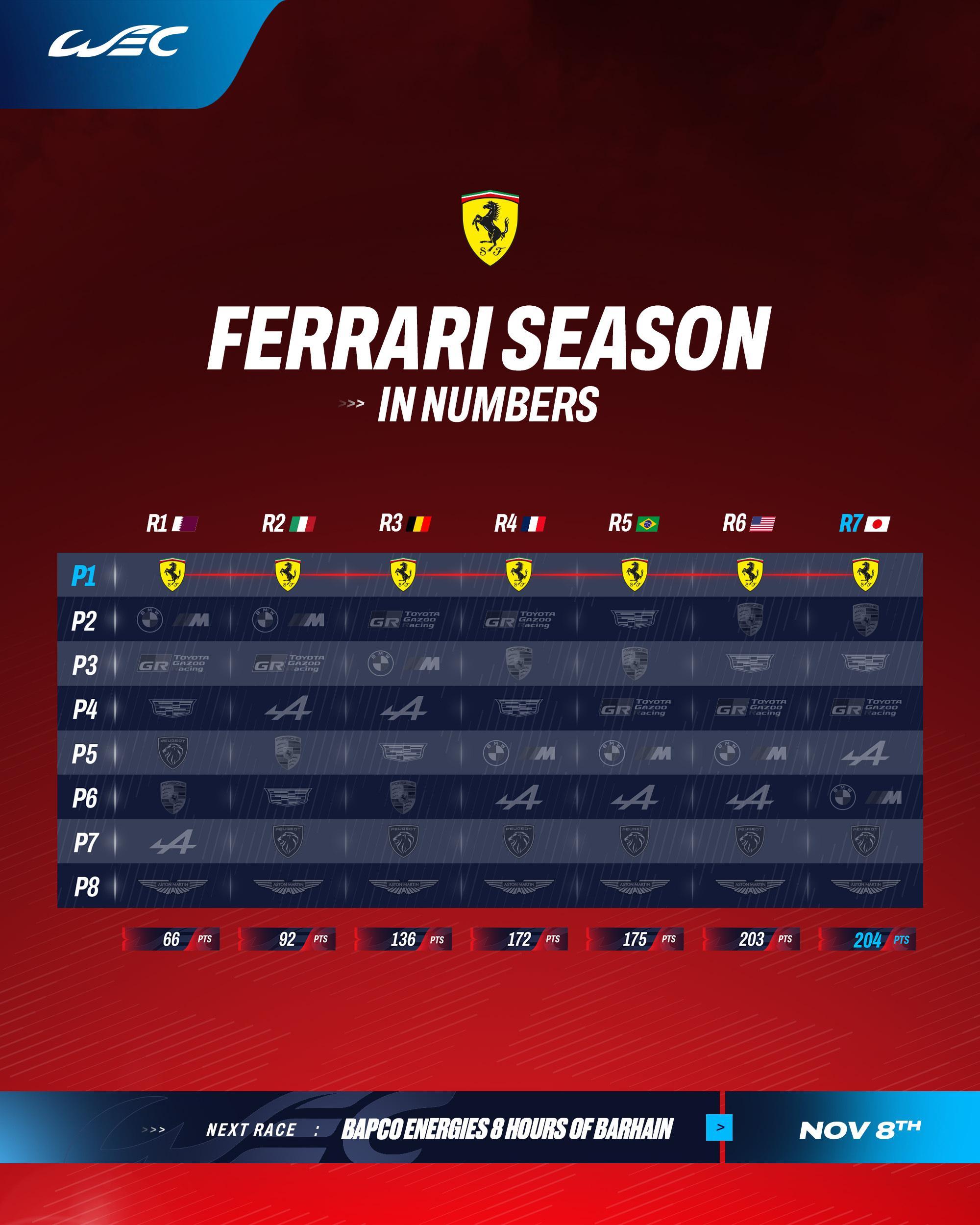 2️⃣ 法拉利无疑是本赛季最强的存在,天胡开局让他们早早建立起了不少的优势,制造商积分全程领跑,虽然下半赛季在劣势赛道和BoP限制下表现下滑,但到巴林之前依然能有39分的优势,讲真,被逆转的可能性其实并不高。
