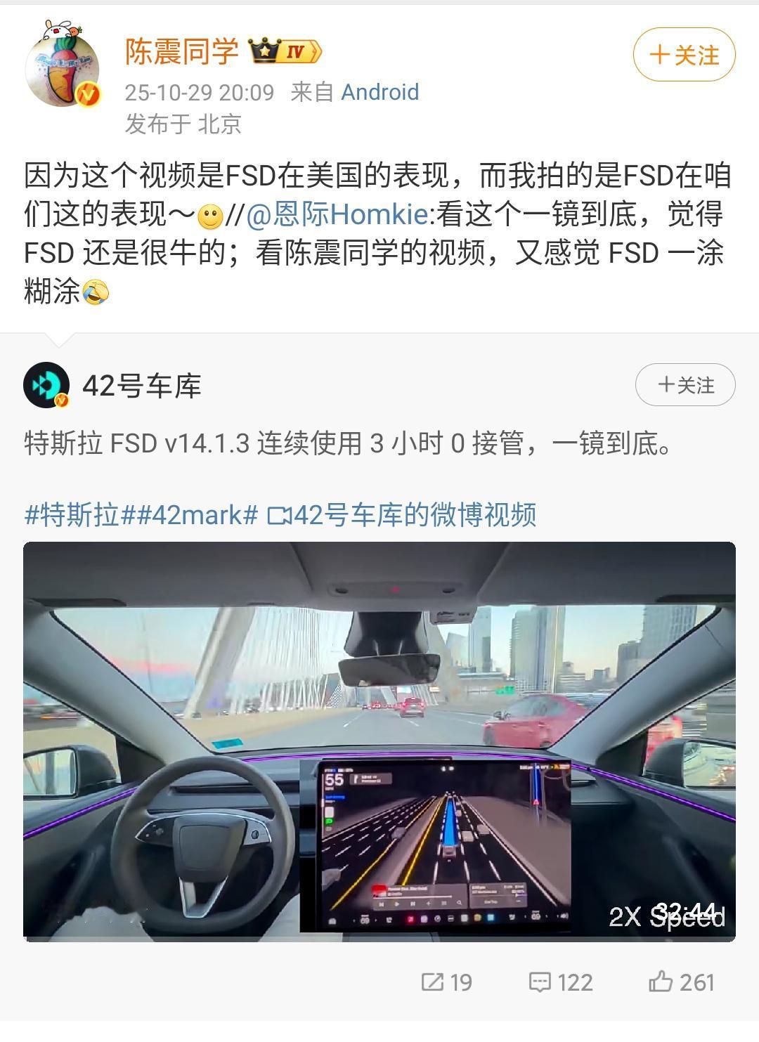 网友表示我怎么看特斯拉的FSD表现挺好的,怎么FSD陈震的眼中就不行了呢? 陈震表示你看的是特斯拉FSD在美国的表现,我说的是特斯拉FSD在国内的FSD。 目前这两款软件差别的都不像是一家公司制作的,由于特斯拉没有办法在国内进行相关的测试工作,所以特斯拉的进化都是通过视频学习的,没有办法收集车载的数据进行迭代。 各位是怎么看的?欢迎评论区留言。