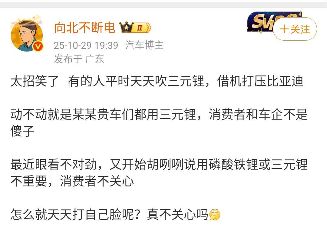 向北:太招笑了…有的人平时天天吹三元锂,借机打压比亚迪 动不动就是某某贵车们都用三元锂,消费者和车企不是傻子 最近眼看不对劲,又开始胡咧咧说用磷酸铁锂或三元锂不重要,消费者不关心 磷酸铁锂的优势就是风险性相比较其他电池风险性小得多,但是能量密度没有三元锂大。这个是一种科学,早在汽车产业发展的时候就已经说过了。 车辆能够保证安全,除了电池的性能之外,还有电池的热管理设计,安全碰撞设计等多个条件共同组成的。