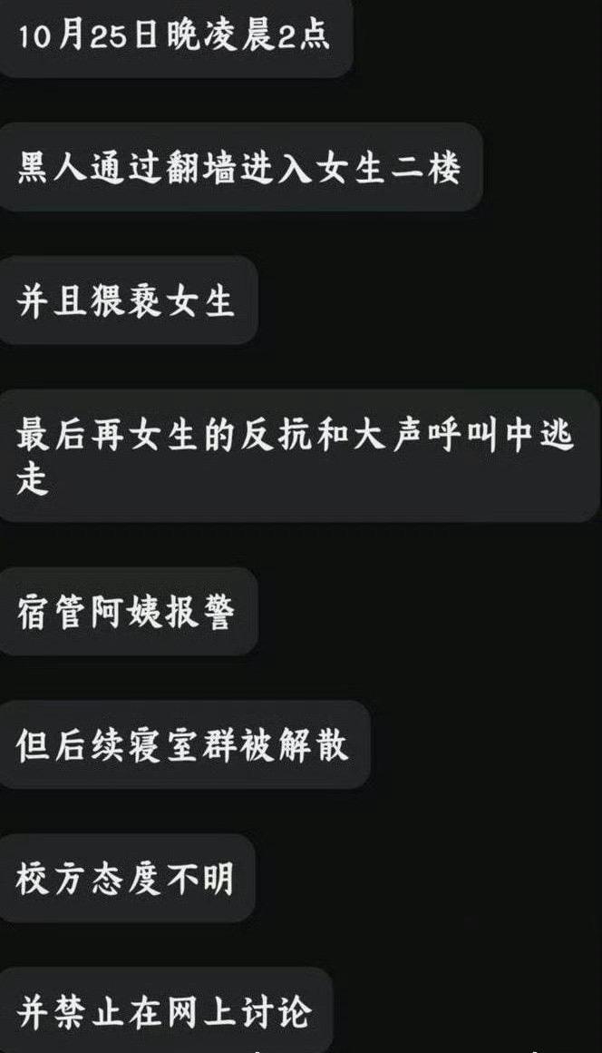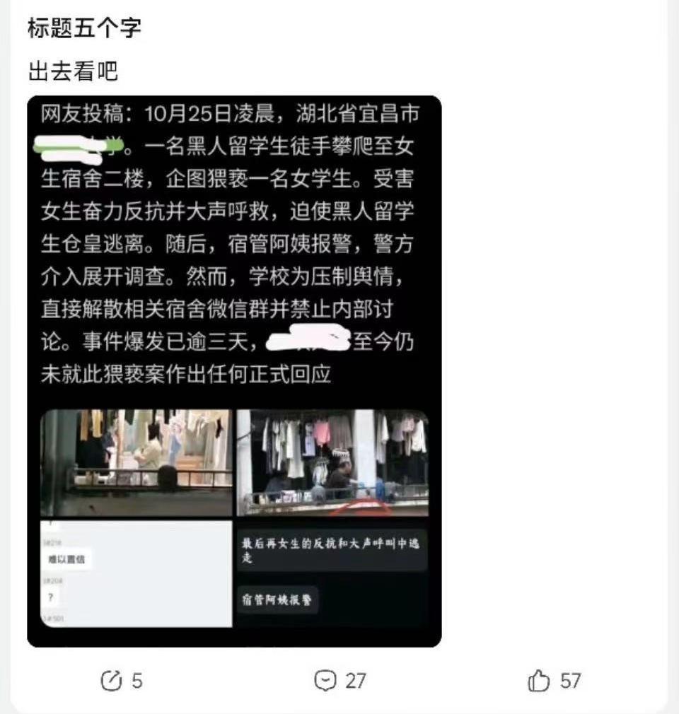 三峡大学事件撕开的遮羞布:我们找的是人才还是“特权隐患”? 凌晨两点的女生宿舍,徒手攀爬的黑影比夜色更惊悚。三峡大学那名闯入寝室猥亵女生的留学生,用最野蛮的方式戳破了“国际化办学”的温情面纱。更让人脊背发凉的不是受伤女生的呼救,而是校方从案发25日到通报29日的沉默,以及那句轻飘飘的“不便透露”。 “留学生光环”早成公开的秘密。为冲国际排名,有的高校把留学生数量当KPI,招生门槛一降再降,却给他们配双人公寓、发高额补贴,反观本土学生连完整的防盗网都配不齐。前有偷窃内衣事件预警,校方只装了一楼钢刺防护圈就草草了事,仿佛二楼的安全不值一提。这种“选择性安防”,不就是给“外籍身份”开的特权绿灯? 网友那句扎心话戳中痛点:“别人去非洲找资源,我们去非洲找人才”。可当“人才引进”异化成“身份纵容”,当刑事拘留、开除学籍的处理要靠舆情倒逼,所谓的“国际化”不过是自欺欺人的笑话。法律里从没有“外籍豁免权”,《刑法》第237条的强制猥亵罪,不会因为肤色和国籍就网开一面。 最该警惕的不是个别留学生的恶行,而是高校管理者的“怕事心态”。怕影响排名就拖延通报,怕引发争议就删评控评,解散微信群堵学生的嘴,却堵不住安全防线的漏洞。加装铁丝网能防住攀爬的手脚,却防不住制度里的“特权惯性”。 我们欢迎带着诚意求学的国际友人,但绝不接受把校园当法外之地的“特权者”。当“找人才”变成“养隐患”,这样的国际化,不要也罢。校园安全的底线,容不得任何身份的践踏。武汉大学乱象