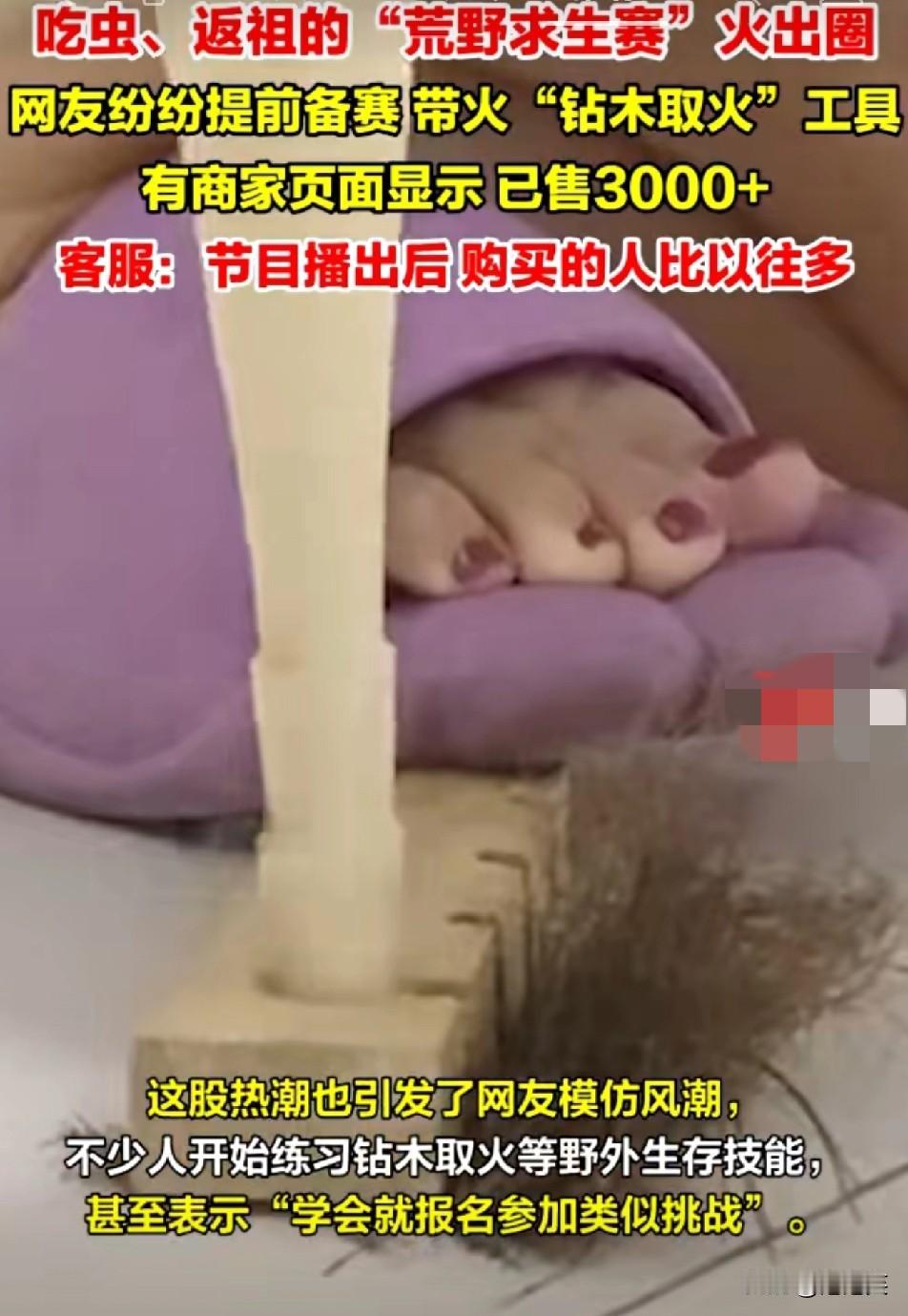 荒野求生赛带火“钻木取火”工具 商家狂卖3000+ 这是集体“返祖”? 张家界七星山的荒野求生赛也太会整活了 吃虫、“返祖”式生存直接火出圈 网友们纷纷提前备赛,把“钻木取火”工具带火了 有商家页面显示已售3000+,客服都说节目播出后买的人比以往多太多 有人乐疯:“现在练钻木取火,是准备回原始社会生活吗?” 也有人好奇:“这工具真能在野外生火?别到时候成了摆设!” 这股荒野求生热也挺有意思,大家对户外生存技能的热情是真高 要是你,会买套工具去试试吗?