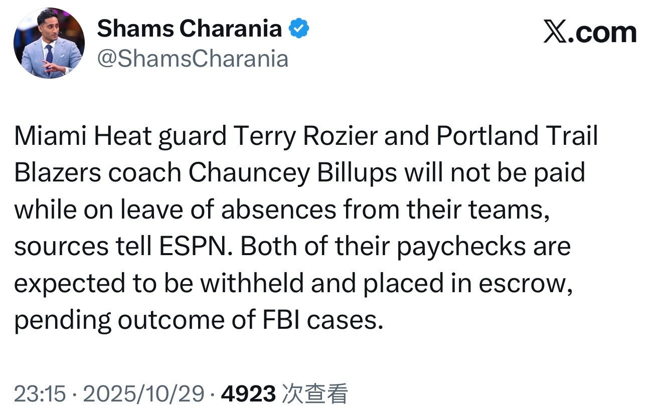 Shams:罗齐尔与比卢普斯在离队期间将暂停领取薪资。两人的工资预计将被暂扣至第三方托管账户,待联邦调查局案件结果出炉后再行处理。