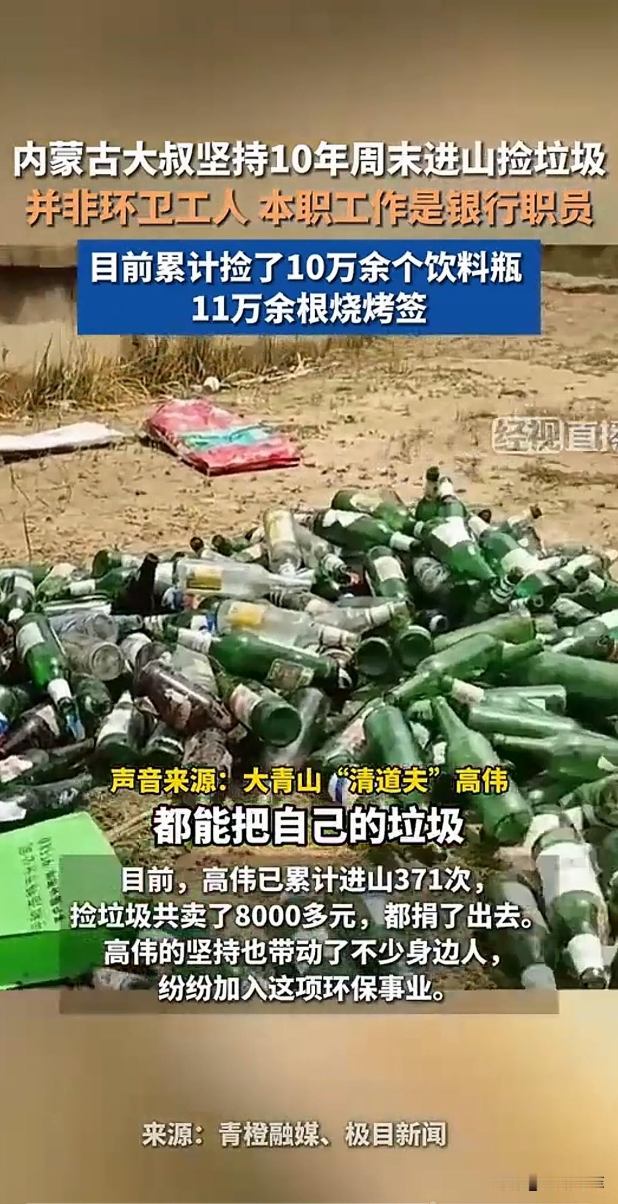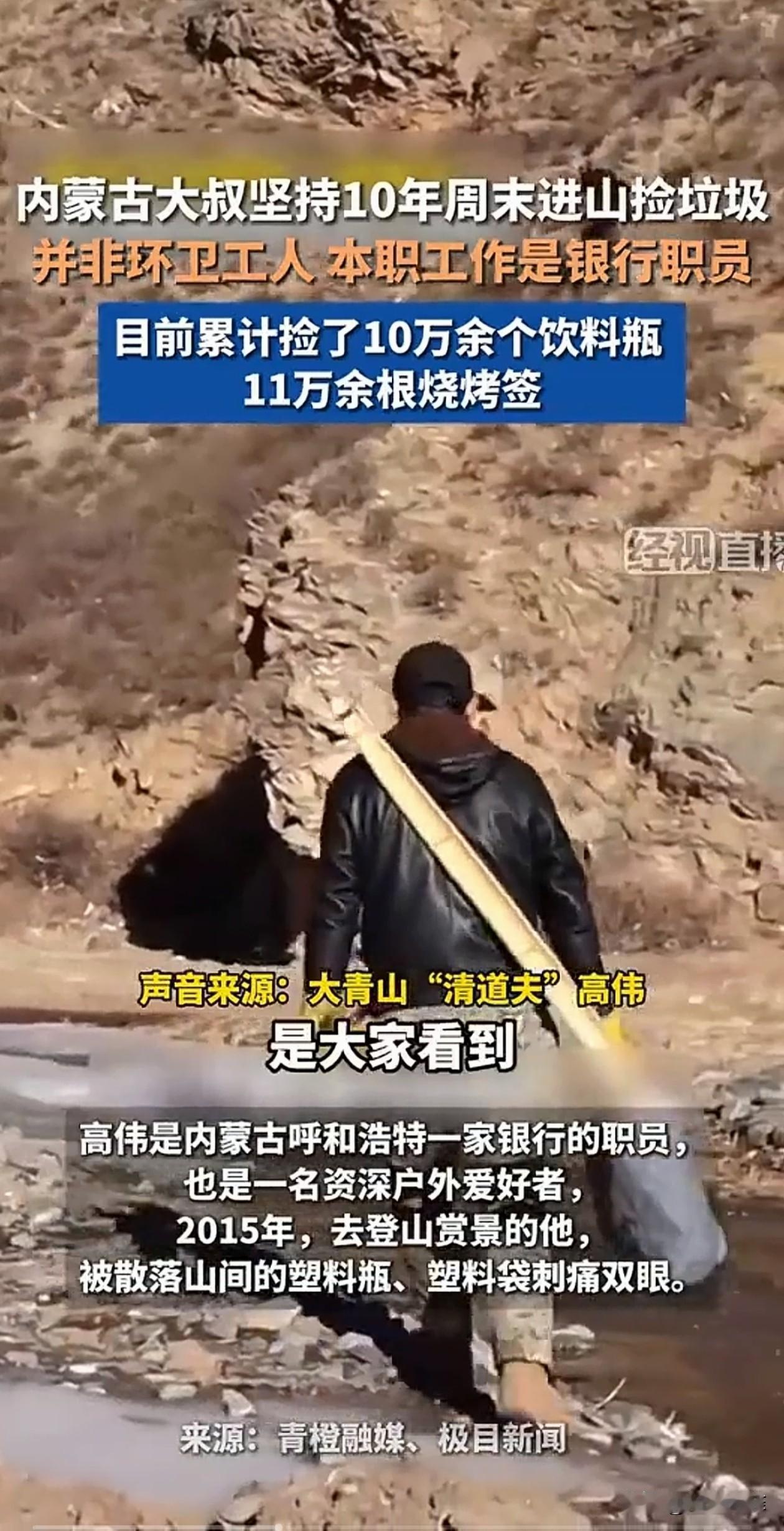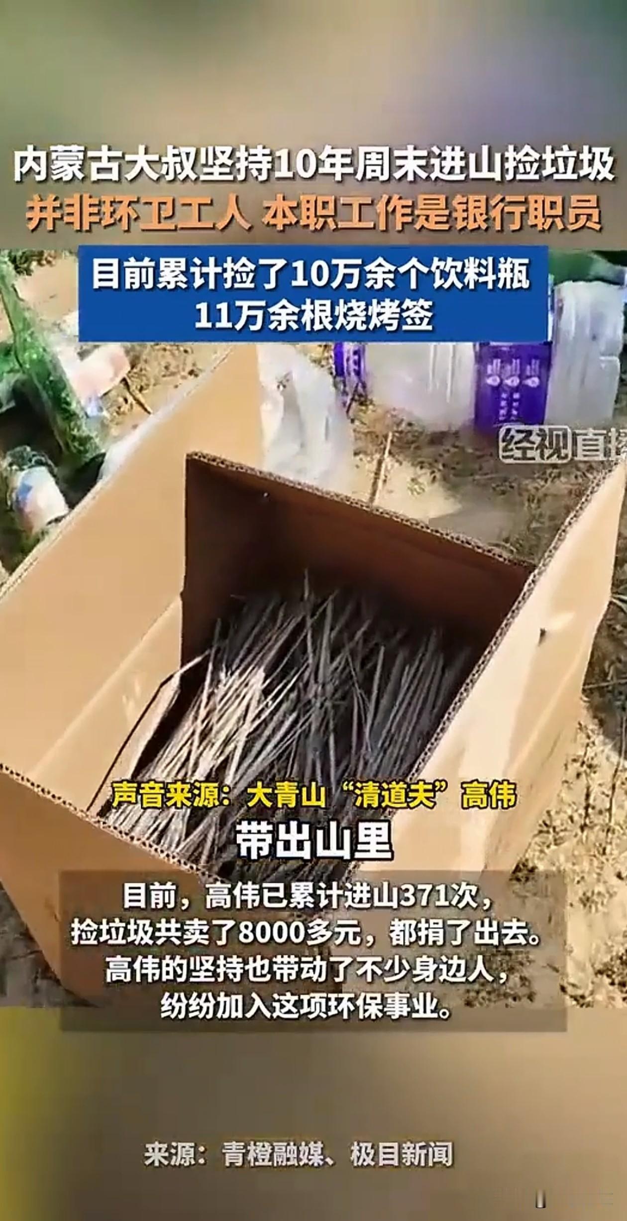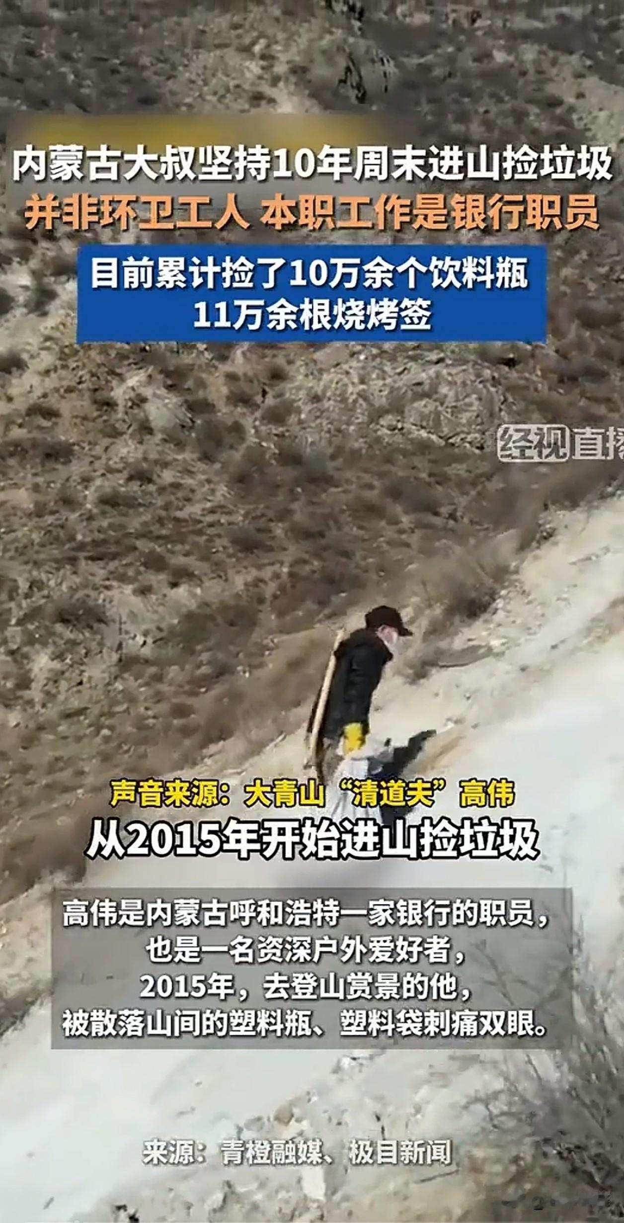 男子去爬山,却偶然养成了捡垃圾的习惯,10年时间,一共进山371次,捡了2万多斤垃圾,后来还号召更多人加入义务捡垃圾的行列,最多的时候超过100人。 内蒙古,男子2015年去大青山爬山,看见山上全是饮料瓶和塑料袋,就随手捡了些带下山。从这之后,他每次去爬山都会带着袋子,专门捡垃圾。 他这一坚持就是10年,总共进山371次,捡了2万多斤垃圾。他是银行职员,把捡的垃圾也做了明细账,详细记录了不同垃圾的数量。 他还给自己定了目标,每年最少捡1万个瓶子或者1万根烧烤签,特别认真。 刚开始他老婆不支持他,觉得又脏又不安全,车上还一股味。后来被他的坚持打动,退休后也跟着一起捡。 他还把捡垃圾的视频发到网上,拉了个群,现在每次要进山捡垃圾就喊上大家一起,少则十几人,多则上百人。 后来,他把捡废品卖的8000元,全部捐了出去,自己一分没留。 现在大家都叫他“大青山清道夫”,觉得他不是搞形式主义,是真的用十年时间把山捡干净了,特别实在。 男子就是一个普通人,但他做的事很伟大,既干净了大山,也唤醒了更多人的环保意识,真的很厉害,让人佩服。
