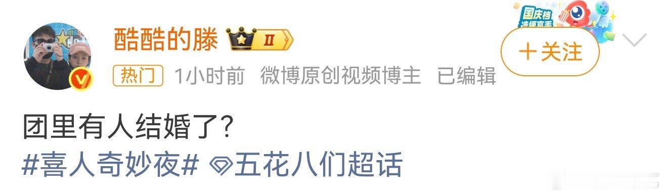 酷酷的滕 团里有人结婚了吗喜人奇妙夜 酷酷的滕你可算问出我们的心声了!今天喜人们在微博疯到离谱,一会儿凑这个的 “婚事”,一会儿 P 那个的 “证件”,热闹得像办集体婚礼,正想问 “到底谁真结了”,就刷到酷滕的灵魂提问!评论区全在喊 “酷滕快去管管这群显眼包”,只能说喜人的营业方式,永远在离谱和好笑之间反复横跳!
