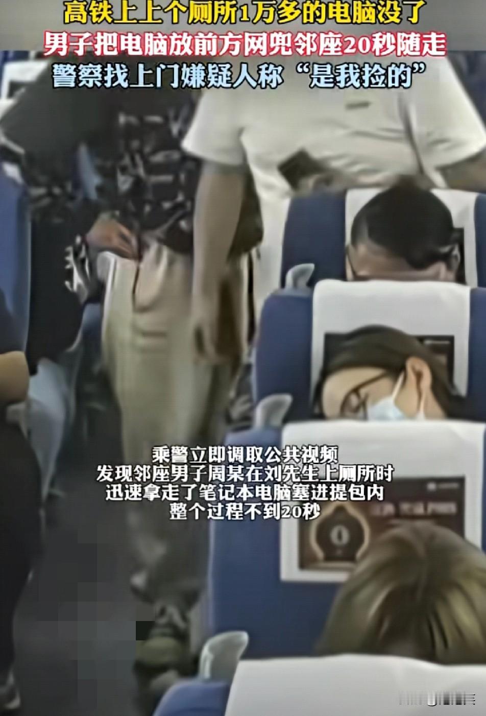 惊到失语 刷到这事儿我都替失主捏把汗 杭州西到连云港的高铁上,刘先生就去了趟厕所 放座位网兜里的14000块笔记本电脑直接没影 调监控一看 邻座周某手速快得吓人,不到20秒就把电脑塞包里顺走了 被警察找到还嘴硬说“是我捡的” 高铁上到处是监控,还敢这么明目张胆“顺手牵羊” 真以为能蒙混过关 要是你遇到这种邻座,能提前察觉不对劲吗