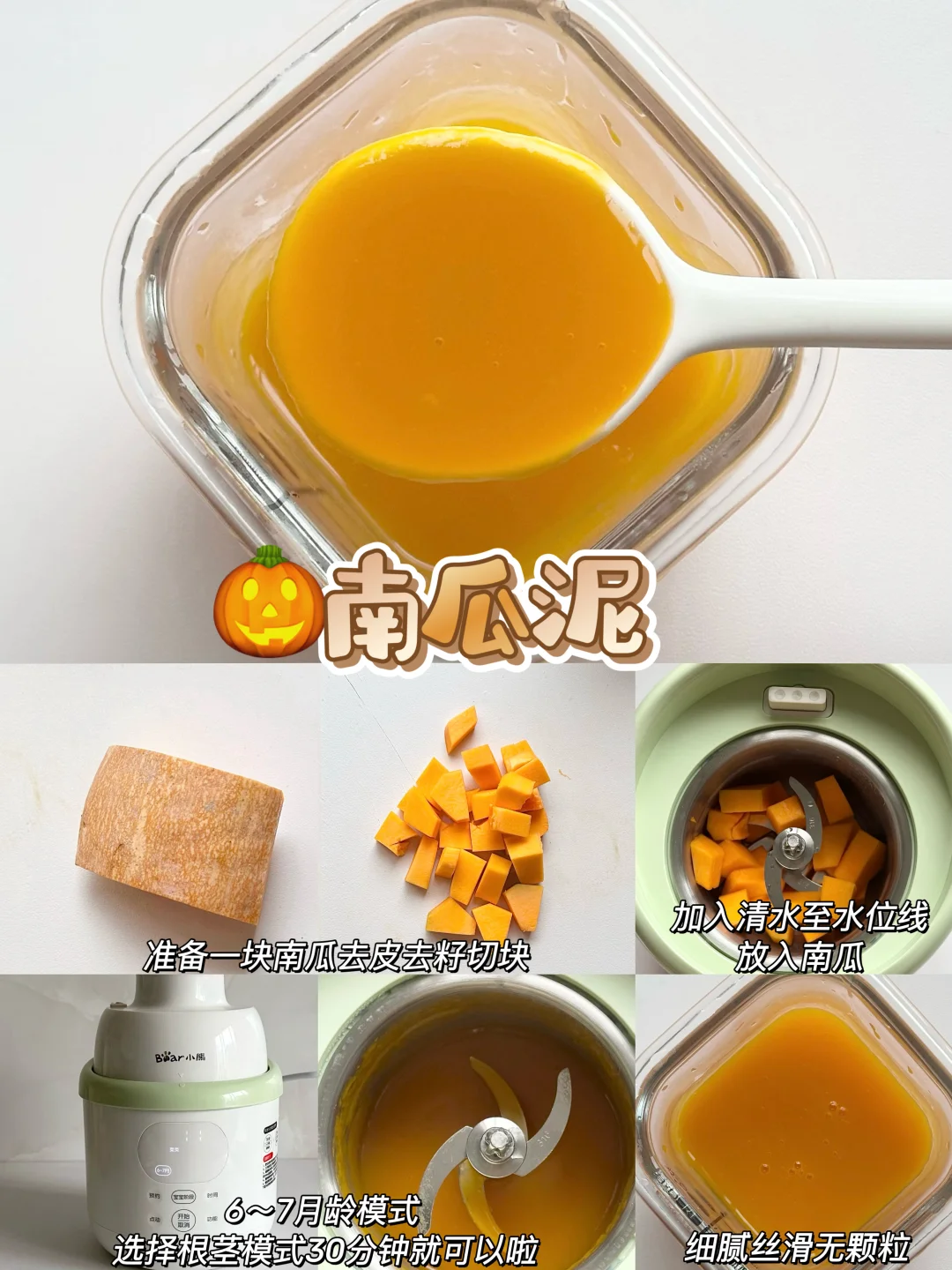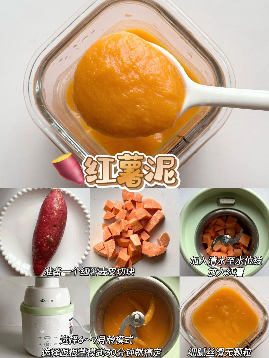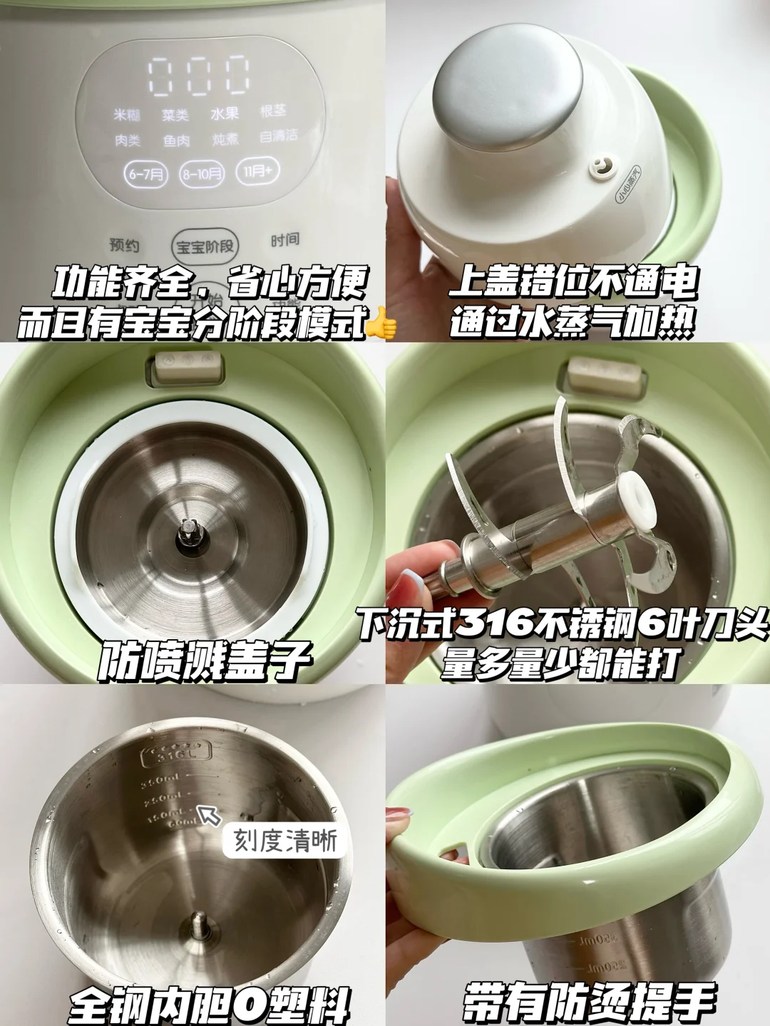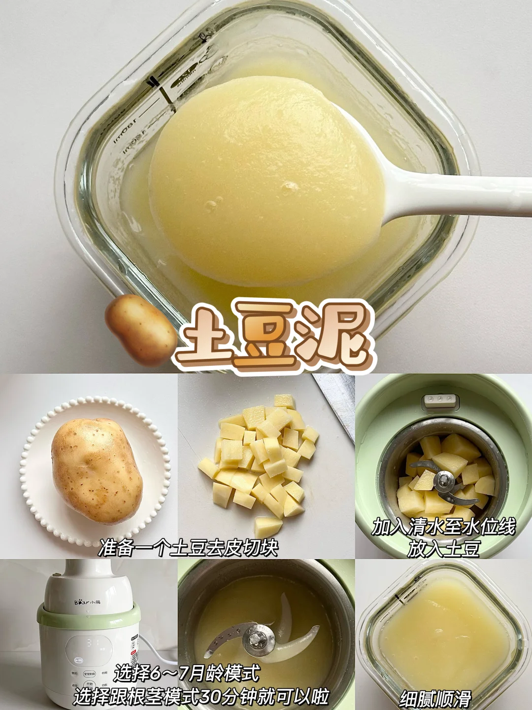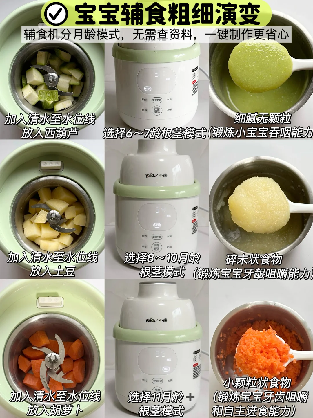 👶🏻宝宝6个月的时候就可以添加辅食啦~纯米粉添加一周后解锁了核桃油,后面开始辅食泥菜泥,肉泥,排敏,今天给大家整理了一下小月龄宝宝初添加辅食泥的做法以及解冻方法,新手麻麻赶快码住咯~ - 🌈初添加菜泥和肉泥都要排敏三天观察有无过敏,然后再继续吃下一种食材~7月龄左右的时候就可以混合搭配食材添加啦~ 关于如何储存和解冻 🌟辅食泥做好后当天吃过一次,剩下的就可以装进模具放进冰箱冷冻,等4个小时左右取出装进食品级密封袋里,下次吃的时候直接放进辅食碗加热就好啦~绿叶蔬菜泥不建议冷冻哦~当天吃当天做就好了! 🌟根茎类和肉类最好做3天的量就可以啦,最长时间不得超过一周哦~ - 💡宝宝添加辅食看起来只需要做食物泥很简便,实际上要洗的东西太多啦,要洗蒸锅、蒸碗、搅拌机刀头刀片…我想着如果能一次性搞定蒸煮和搅打的工具就好啦! 结果发现了这个小熊小食光辅食机,一键蒸煮+搅打不用有其他操作,从微量到大容量都能搅打细腻,宝宝蔬菜泥、果泥、肉泥都可以一键操作,再也不用洗那么多工具! 而且预设了从6个月到10个月的辅食程序,制作的时候按照宝宝月龄选择程序,就可以自动制作啦,全程只需要把食材切一下放进去,实在是太省心了! 接触食材的部分都是全316+304不锈钢内胆和刀片,宝宝吃着安心,麻麻更放心 清洁无死角可拆洗,轻松搞定各种辅食,有了这款辅食机麻麻再也不用担心啦~
