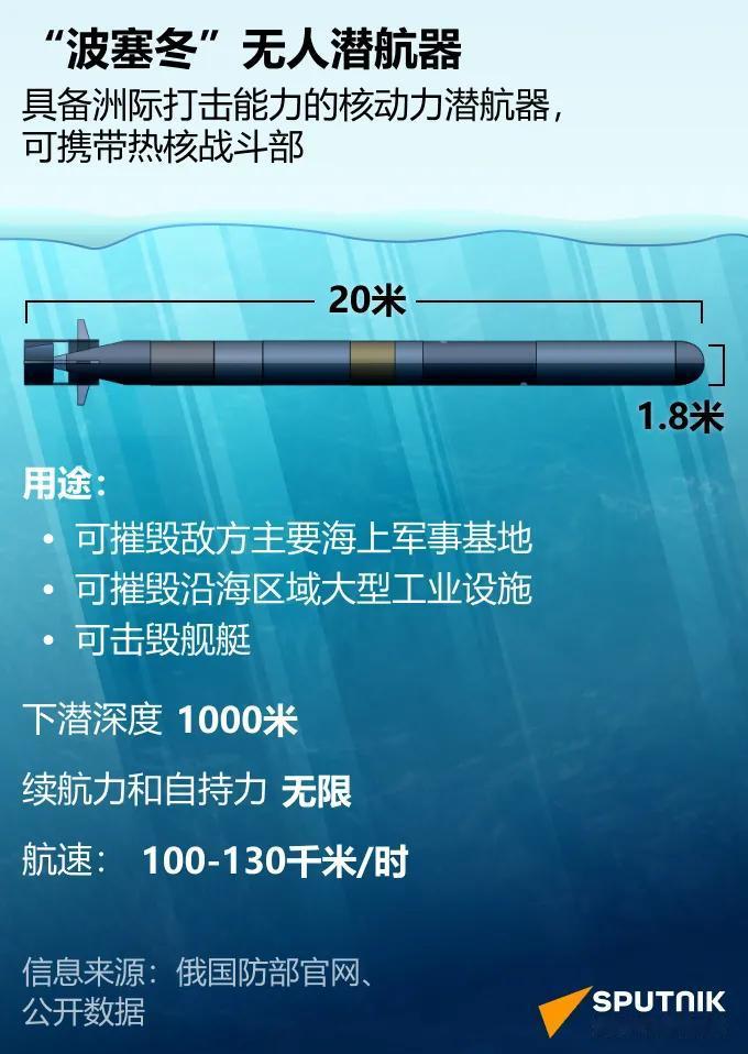中美韩国庆州会谈前夕,俄罗斯总统普京29日正式确认,俄方已成功完成“波塞冬”无人水下航行器的测试。这款被西方称为“末日武器”的超级装备具备:一,极致威力;二,全球唯一。 “波塞冬”究竟是什么? “波塞冬”实质上是一款由紧凑型核反应堆驱动的巨型无人水下潜航器(可视为一种核动力超级鱼雷)。无限航程极深潜航超高速无限航程:核动力赋予了它近乎无限的续航能力,可在深海自主巡弋数周乃至数月,随时待命。 极深潜航:能下潜至1000米以下的极端深度,使现有几乎所有反潜手段都对其无效。 超高速:据信其水下速度可超过100节(约185公里/小时),极大增加了拦截难度。“波塞冬”主要执行两大战略任务: 1.打击沿海目标:其携带的百万吨级核弹头如在敌国近海引爆,能人工制造高达数十米的海啸,彻底摧毁沿海城市和关键基础设施,并造成大范围的长期放射性污染。 2.摧毁航母战斗群:可直接突破航母编队的层层防御,对核心舰艇实施毁灭性打击。 无法防御的战略威慑 “波塞冬”为潜在对手带来了一个在可预见的未来几乎无解的难题。传统的导弹防御系统对其深水高速攻击束手无策。其长时间的战备巡逻使得行踪莫测,构成了持续的威慑。更重要的是,它的打击造成的不是点状破坏,而是大陆规模的毁灭,这使得即使发动先发制人的核打击也失去了意义。 随着测试成功,标志着“波塞冬”正从研发阶段转入实战部署。