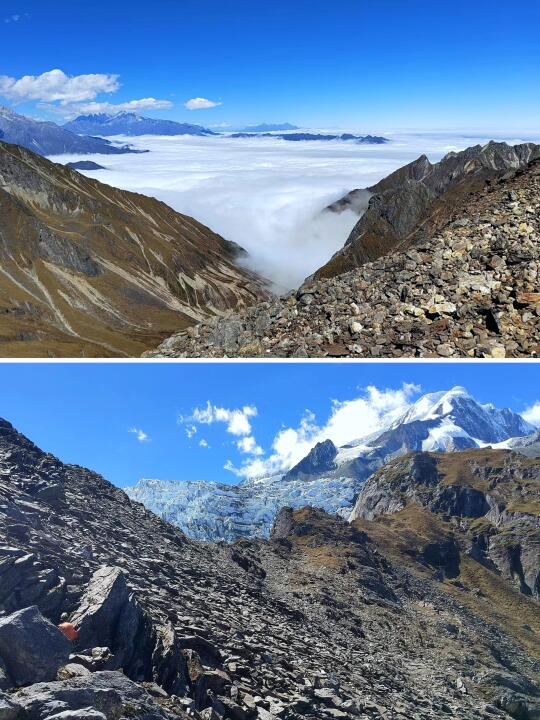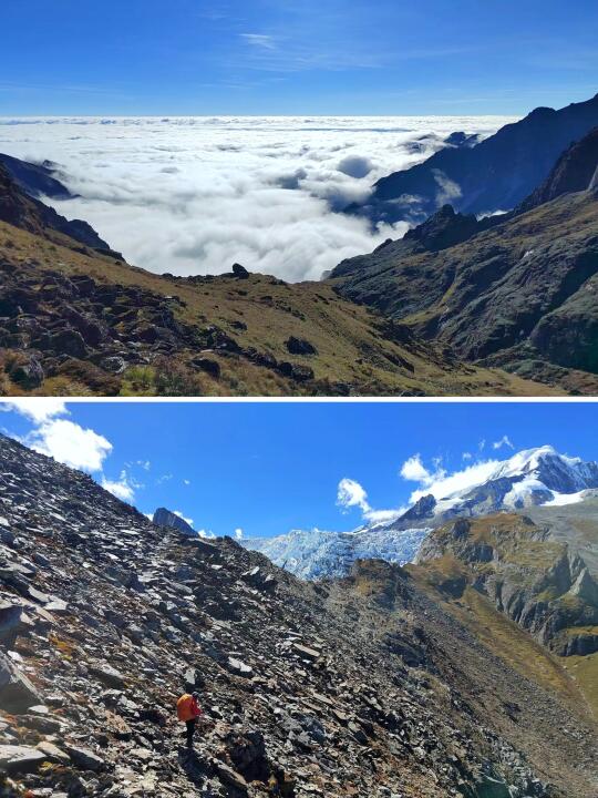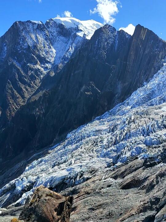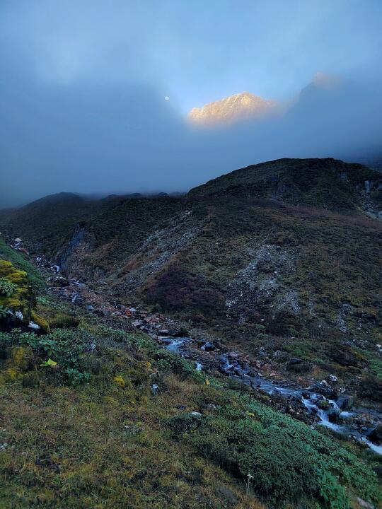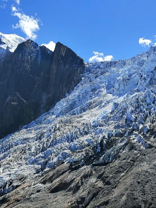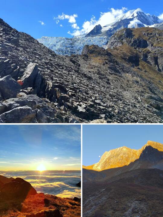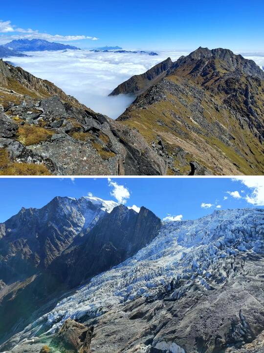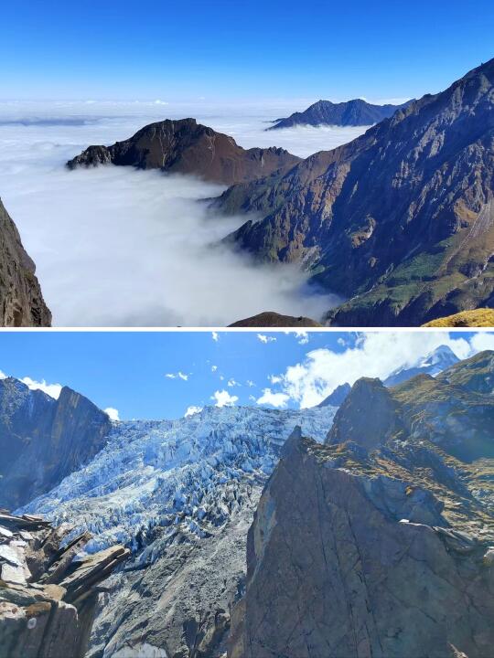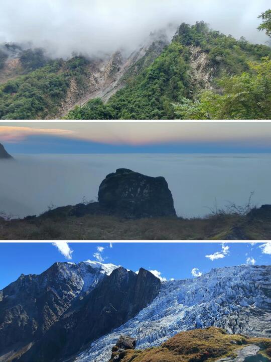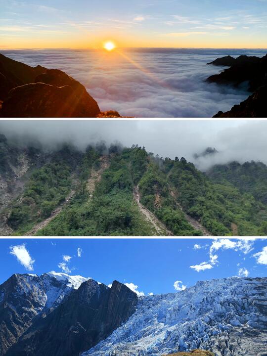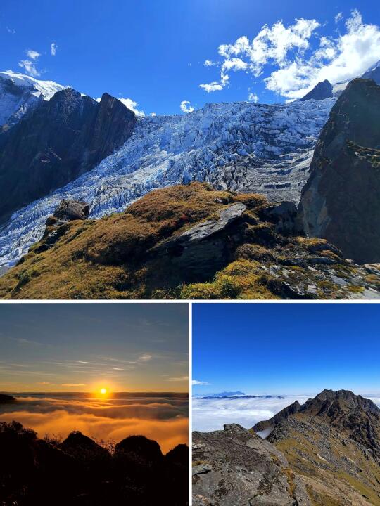 🌈中山峰为四川第二高峰,距贡嘎主峰直线距离约3公里,离成都近300公里,山峰是以孙中山先生的中、英文名字命名,其东侧有一条巨大绝美的冰川,山体巨大,天气晴好的时候能从成都看到全貌。因其冰塔林非常壮观震撼,加上云海、日出、星空、雪山及其金山更是梦幻之境,进而走进大众视野,除了受攀登人员喜爱外,近几年也成为我们徒步人的梦想之地,线路本来危险性大,地震后则更加艰难。由于燕子沟以前只允许攀登人员进出,从而徒步爱好者只能走风险更大的磨子沟,现在管理方改变了方法,大家也可以从燕子沟进出,为了安全及加强管理必须请向导,每天500。燕子沟线路从海拔2300米的自来水厂过桥(现村民自建桥收50)开始徒步,累计爬升近3000米,抵达海拔5050的中山峰大本营,欣赏旁边的磨子沟冰塔林及日出、云海后再原路返回,天气好可以多扎营一天探索冰塔林。长约25公里,根据自身情况一般为3-5天 👫🏼线路参考 D1出发地→成都→磨西镇(成都新南门汽车站有直达磨西镇的9人小型客车,每人130,到徒步起点可让民宿老板接送300) D2徒步7公里:磨西镇→燕子沟水厂(过桥费50)→牛棚营地 D3徒步5.5公里:牛棚营地→中山峰大本营(天气好可多呆一天) D4原路返回12.5公里:大本营→燕子沟→磨西镇→各找各妈 ⚠️Tips ✅这条线不是有腿就行,会虐到你怀疑人生!除了要有长期高海拔重装徒步经验外,个人还得不恐高不胆小,四肢协调力强及团队还要有合作精神;线路除了3个长陡坡和多处滑坡落石路段及碎石坡外,雨季蚂蝗也多;滑坡路段建议携带绳索,注意观察,迅速通过 ✅高海拔线路,短距离爬升大,千万不可逞能,自视清高,要根据自身情况合理安排行程,有不适要及时下撤 ✅出行前看好天气预报,确保大范围里气候稳定 ✅路餐建议带点牦牛肉干、牦牛奶糖或炒熟的青稞粉等,另外带点葡萄糖及防高反的药 ✅昼夜温差大,做好防寒保暖工作,喜欢出汗的姐妹可多带几条头巾休息时放背上隔汗,以免引起感冒;高原紫外线强,注意防晒䃼水 ✅向导不背东西,请背夫统一为70/kg ✅冰塔林内部裂缝很多,不要太深入,多观察;小山坡有电信信号 ✅森林里野生动物多,有熊、狼等,天黑前一定要扎营 ✅山顶风大,扎营时要系好风绳,找大石头在四周固定 ❤部分图片来自好友细雨,谢谢!