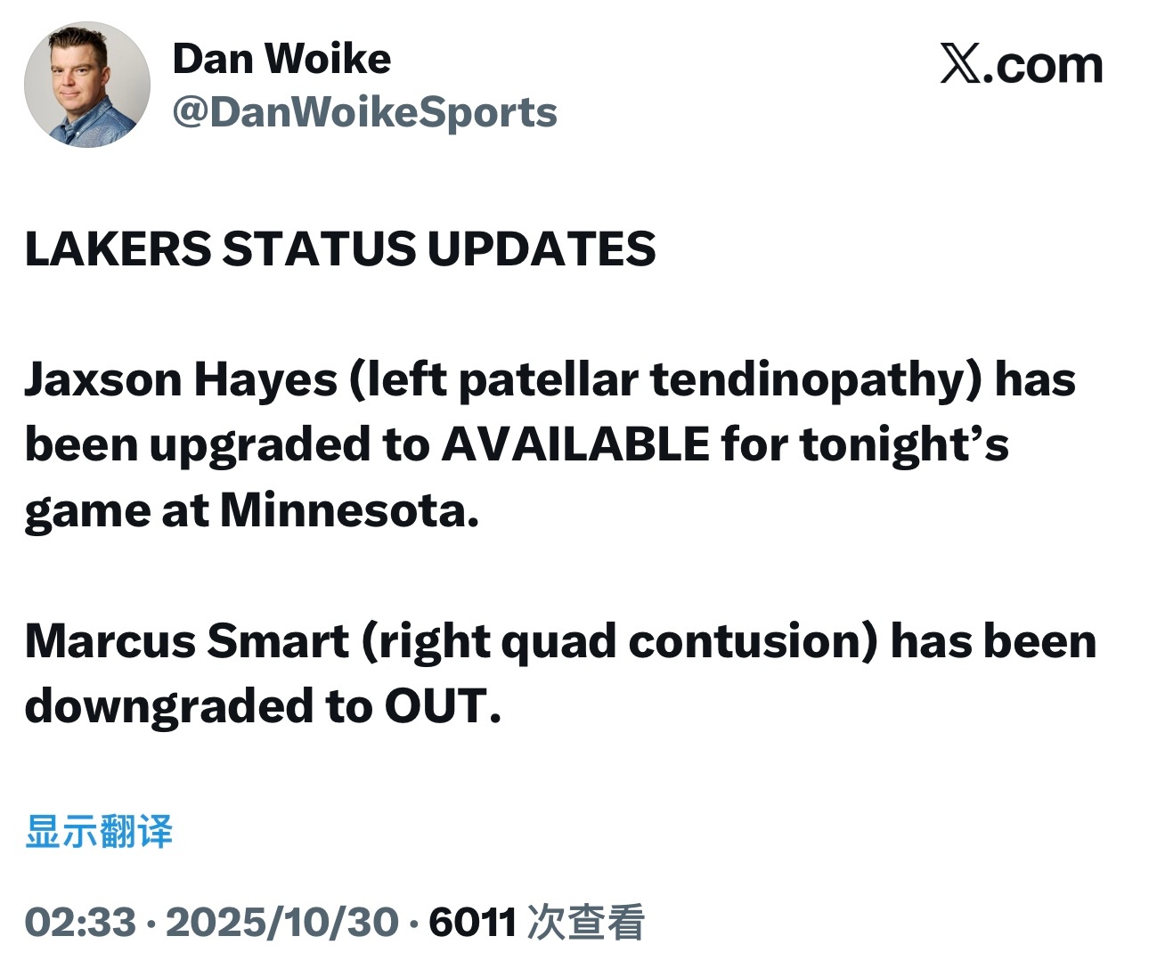 海斯(左髌骨肌腱炎)今天复出,可以出战客场对阵森林狼的比赛。斯马特(右股四头肌挫伤)连续第二场比赛缺阵。