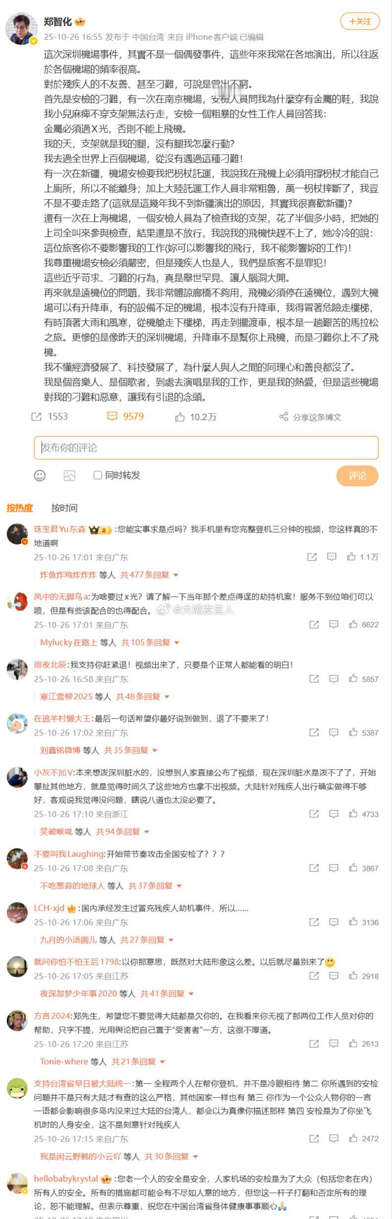 郑先生身为网络名人,对登机现场进行了描述,最初引起了巨大的舆论支持(图1高赞全支持郑、讨伐机场),舆论对深圳机场形成相当的批评和负面评价,看看那些词汇,“冷眼看著我連滾帶爬進飛機”、“深圳機場對殘疾人的態度是最沒人性的”,10月25日我第一眼看到这段文字,真心地以为郑先生手脚触地、身体触地爬行了,真心以为机场服务员全程袖手旁观、冷血无情,我当时就想看看现场视频,看看深圳机场能“最沒人性”到什么地步?[吐][吐]