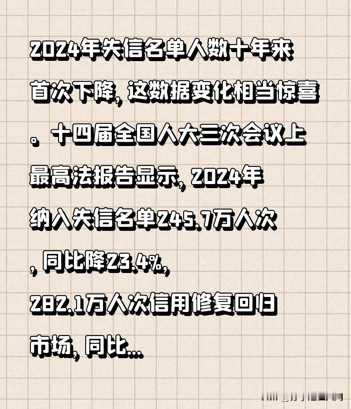 2024年失信名单人数十年来首次下降,这数据变化相当惊喜。十四届全国人大三次会议上最高法报告显示,2024年纳入失信名单245.7万人次,同比降23.4%,282.1万人次信用修复回归市场,同比增35.4%,修复人数超纳入人数。 今年一季度数据也很乐观,新纳入失信名单39.42万人次,同比降9%,完成信用修复超40万人次。最高法对失信者惩治与信用修复两手抓,精准区分“失信”与“失能”。这不仅保障当事人权益,还推动社会诚信体系建设,为法治化营商环境助力,希望这良好趋势能一直保持下去。 失信人 失信人新政策 失信人 失信人新政策 失信问题 失信 九类严重失信人 失信必付出代价 失信成本