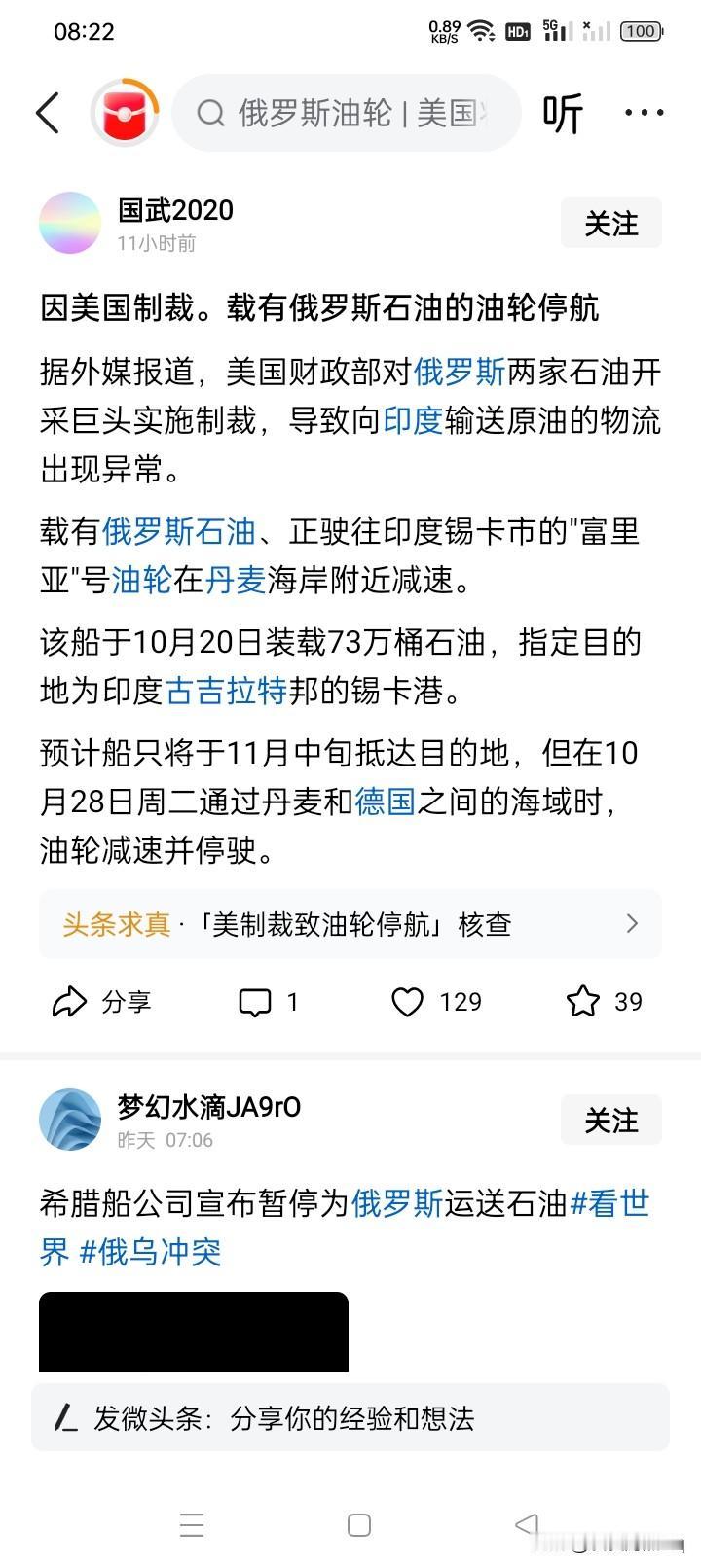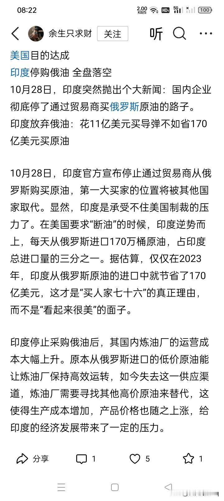 印度似乎也顶不住了? 美国对俄罗斯两家最大的两家石油公司实施制裁以后,作为进口俄罗斯数量最大的国家印度,是否会迫于美国的制裁,而停止或大幅减少进口俄罗斯的石油,成了引人注目的事情、甚至是关系到美国制裁成败的问题。 10月28日,印度宣布,该国企业彻底停止从贸易商购买俄罗斯的石油。当然,是否彻停止购买俄罗斯的石油,仅仅是个表面上的事情,具体情况还有待进一步观察。因为如此庞大的石油交易,也不是说彻底停止就可以停止的。 但是,网络上有一条消息大概可以对此作某些佐证。一艘载有73桶石油的“富里亚”号油轮,10月20日从俄罗斯启航(那个时候美国还没有对俄罗斯的石油出口宣布进行制裁),目的地是印度的古吉拉邦的锡吉港,但在10月28日通过德国与丹麦之间的海域时,突然减速并停止航行。对于这种情况,有分析认为,好像可能是美国的制裁起的作用,印度似乎拒绝再接收俄罗斯石油。 印度与俄罗斯和美国的关系应该说都还差不多,但如果权衡利弊,分析孰轻孰重,大概只有印度人最清楚。