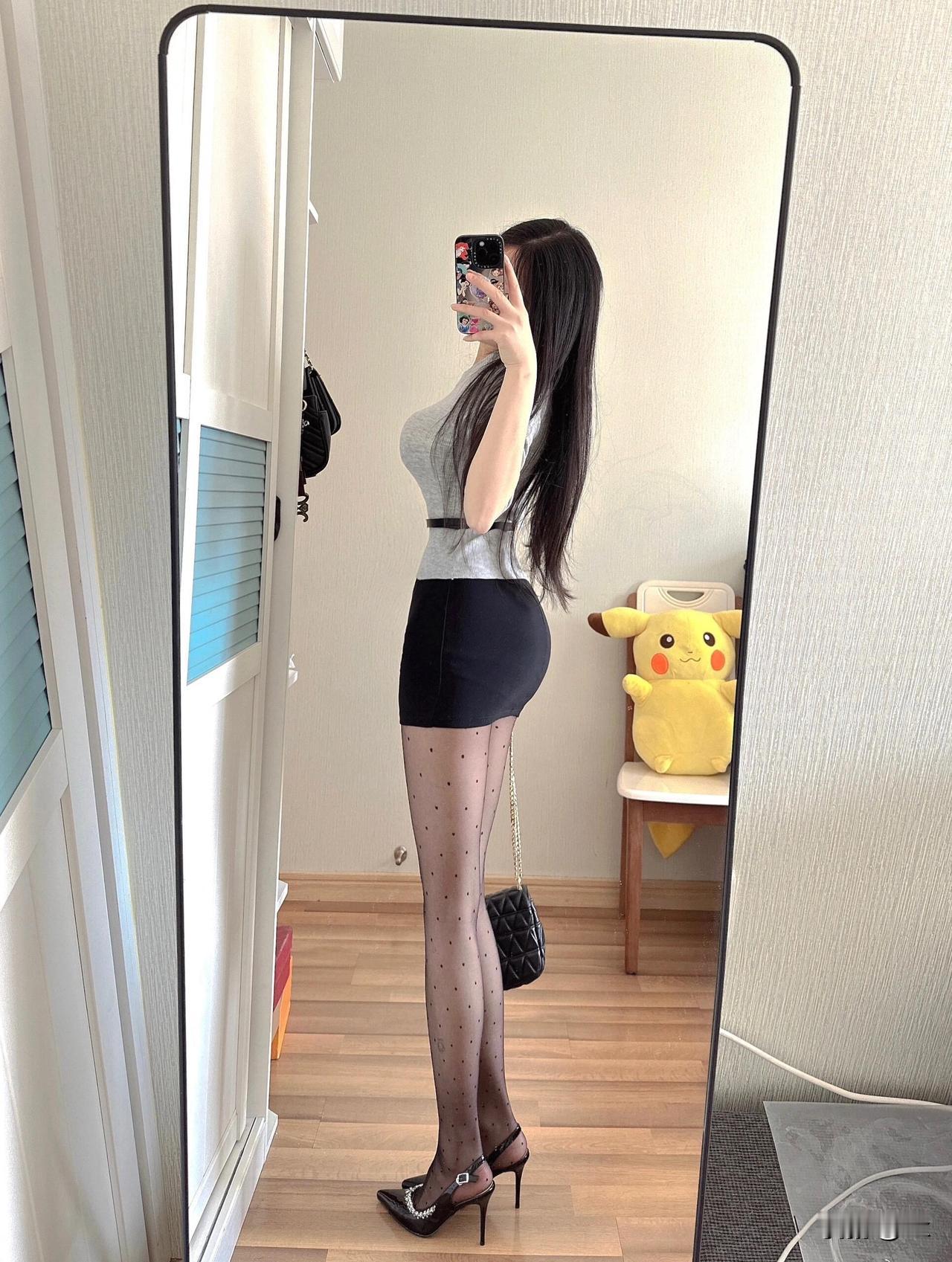 纯欲轻熟风!灰上衣+波点黑丝,镜面自拍绝了🤍 救命!镜面自拍穿这套直接被夸“比例王者”~ 灰色修身短上衣+黑色包臀裙,搭配波点黑丝和水钻高跟鞋,拎着菱格链条包,站在全身镜前拍,居家的温馨背景一衬,甜辣又显身材的氛围绝了,日常出街或者约会穿这套,朋友都问“这腿长是真实的吗”~ 已经把搭配分享给闺蜜,咱就是说,轻熟与纯欲的碰撞真的太显比例!