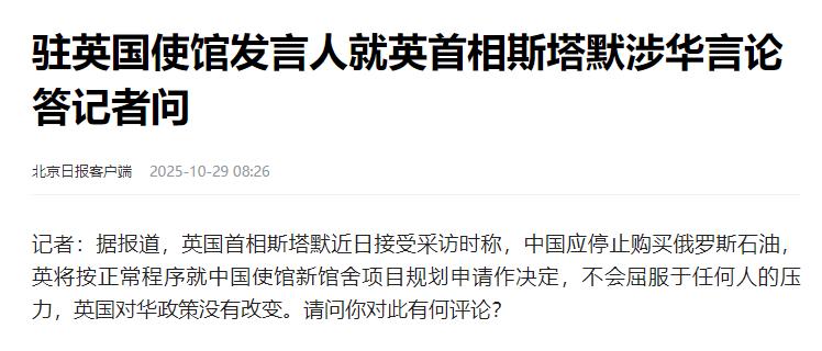英国首相斯塔默最近干了两件让人惊掉下巴的事儿! 他说不管受到多大压力,都不会批准中国驻英新使馆项目。这可太离谱了,正常的外交设施建设,又不违反任何规定,他到底在顾虑什么?更过分的是,斯塔默还要求中国停止购买俄罗斯石油。 两件事凑在一起,明显是故意针对中国,就先说这中国驻英新使馆这个项目,本来是2018年就定好的事儿,中方花2.55亿英镑买下伦敦塔附近的原皇家铸币厂旧址,想建个合规的现代化馆舍,结果硬生生拖七年。 说起来这项目也是够委屈的,图纸按英国标准设计,环保、安全评估样样齐全,当地市政部门一开始都点头说没问题,中方前后六次提交补充文件,连英国军情五处的安全建议都乖乖吸纳了。 可审批日期就像个橡皮筋,从2025年8月拖到10月21日,再顺延到12月10日,英方就靠一句“现在不是时候”搪塞,最近10月28日斯塔默干脆摊牌,说就算施压也不批,这哪是什么流程问题,分明是拿外交设施当政治筹码玩,更耐人寻味的是,他放话前两天刚跟特朗普通过电话,而白宫早就打过招呼不希望项目获批,这时间差卡得比钟表还准。 更离谱的是他还顺带要求中国停止购买俄罗斯石油,这就有点跨界碰瓷的意思了,中俄能源合作本就是市场行为,2024年中国从俄罗斯进口原油1.08亿吨,占总进口量近五分之一,2025年前九个月更是逼近9000万吨,每天超200万桶流入炼厂,全是基于平等互利的商业选择。 斯塔默倒好,自己国家还在通过希腊转运俄油,把俄油登记成“德荷进口”,2022年就有39批、超2亿英镑的俄油靠这招流入英国,转头倒对中国指手画脚,这种只许州官放火的操作,连基本的逻辑自洽都顾不上了。 斯塔默把两件八竿子打不着的事绑在一起,其小算盘其实不难猜:对内,他刚因证据不足撤销所谓“中国间谍案”遭保守派骂对华软弱,急需靠强硬姿态转移视线;对外,想靠配合美国制裁俄能源换取贸易上的让步,毕竟特朗普政府早就威胁要对英钢铁加征关税。 可他忘了英国自己的处境,2024年中英双边贸易额已比上年下降12%,国内通胀高企、财政吃紧,这会儿主动给合作设绊子,纯属给自己添堵。 而且,咱们中方的态度一直很明确,驻英使馆发言人直接点破,为外交馆舍提供便利是东道国的国际义务,这在国际法和中英建交公报里写得清清楚楚;至于能源合作,商务部早就表态,正常商业往来不该受无端干扰,英方10月15日制裁11家中国企业连证据都没有,纯属蛮不讲理。 说白了,中国既不是任人拿捏的软柿子,也不会接受“用主权换审批”的荒谬交易。 只能说,斯塔默这套操作实在不明智,外交讲究的是契约精神,七年拖延已经耗损了中英互信,再把使馆和能源问题乱挂钩,只会让英国的国际信誉更打折扣。 要知道,中国有庞大的市场和替代合作伙伴,而英国在经济复苏节骨眼上,真经不起这样折腾,或许斯塔默能靠一时强硬刷点政治存在感,但长远来看,拿双边关系当赌注,最终只会砸了自己的脚,毕竟国际交往不是过家家,想靠耍小聪明施压大国,未免也太天真了。