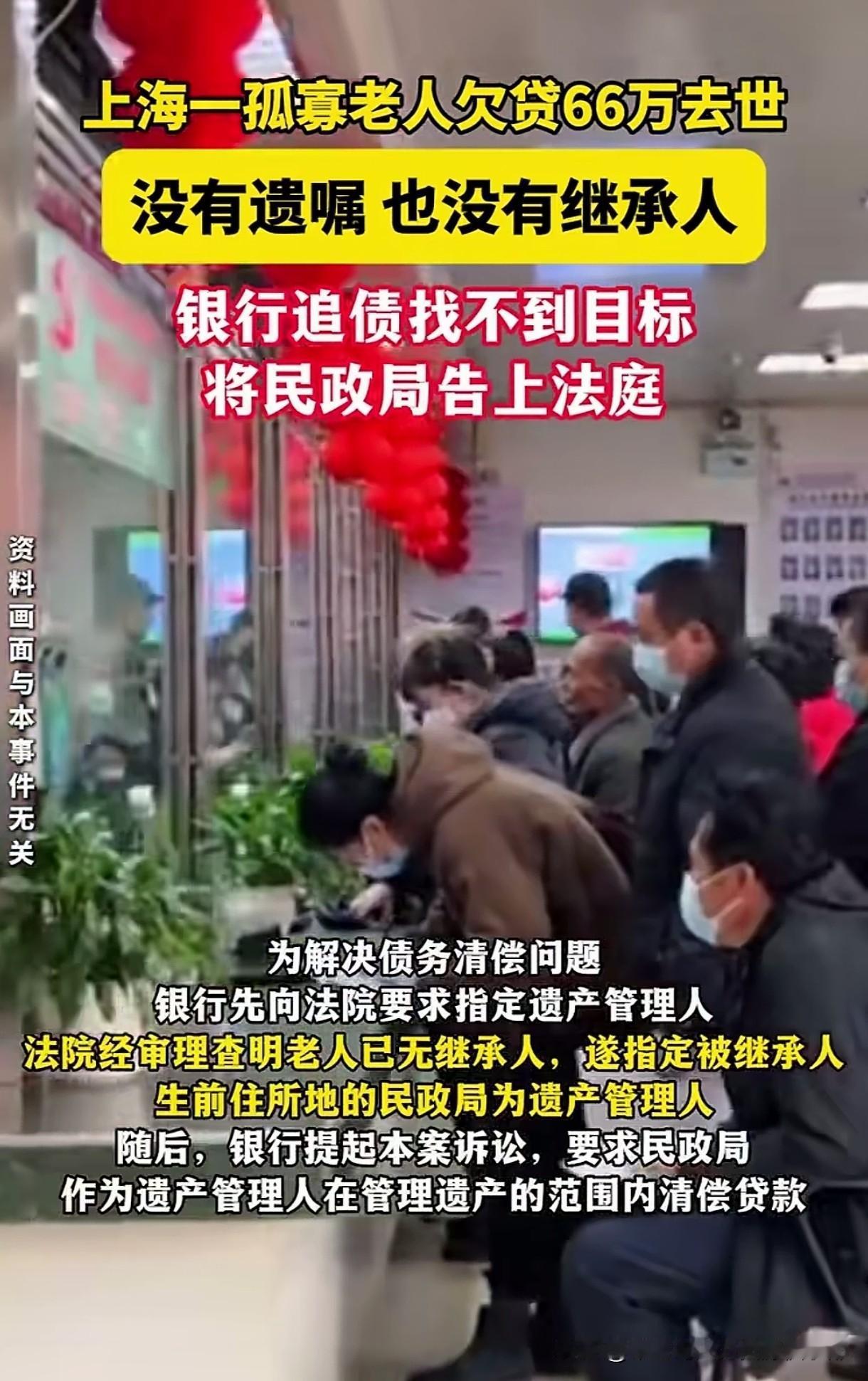 上海孤寡老人欠贷66万去世无继承人,银行竟把民政局告了! 这事儿太有戏剧性了!上海一位孤寡老人去世后留下66万贷款没还,既没立遗嘱也没亲人继承。银行追债追到“无人区”,干脆把当地民政局告上法庭,要求指定遗产管理人还钱。法院一查,老人真就“绝户”了,于是按法律把民政局推上了“还债岗位”。 老话说“人死债消”,但现代法律不认这个——只要遗产还在,债务就得有人管。问题是,这钱最后谁来兜底?网友神评一针见血:银行催债时比谁都积极,可老百姓存的钱要是家属取不出来,他们比谁都“严谨”!更扎心的是,最惨是“人走了钱没花完”,最好的是“人走了债没还完”——横竖别亏着自己,该吃吃该喝喝! 大家怎么看这件事呢?评论区聊一聊吧!