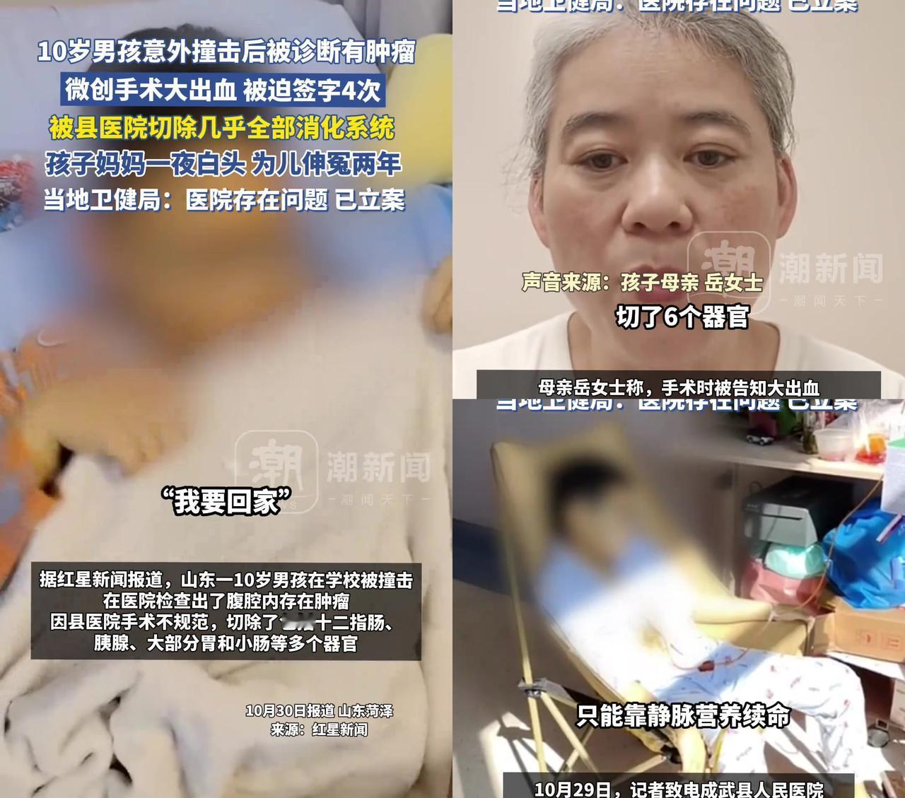 手术室外的四次签字,把妈妈的手都签抖了。 10岁男孩学校被撞,县医院说腹腔有肿瘤,要做微创。 结果手术中突然大出血,护士急着喊:快签字!不签就停治疗! 妈妈的手直发抖,笔杆滑了三次,才歪歪扭扭签完,一共四次。 最后呢?孩子的十二指肠、胰腺、大半胃和小肠,全被切了。 有人说:为啥不去大医院? 妈妈哭着说:我哪懂啊!医生说能治,我就信了。 普通家庭哪有跨级就医的门路?哪敢跟医生顶嘴? 现在孩子12岁,两年没吃一口饭,靠输液活着,尿袋挂在腰上。 妈妈一夜白头,跑了两年信访局,鞋底都磨破了。 卫健局说医院有问题,立案了,可赔的20万,够孩子治多久? 要是你在手术室外,护士催着必须签,你敢说不吗? 大家怎么看?