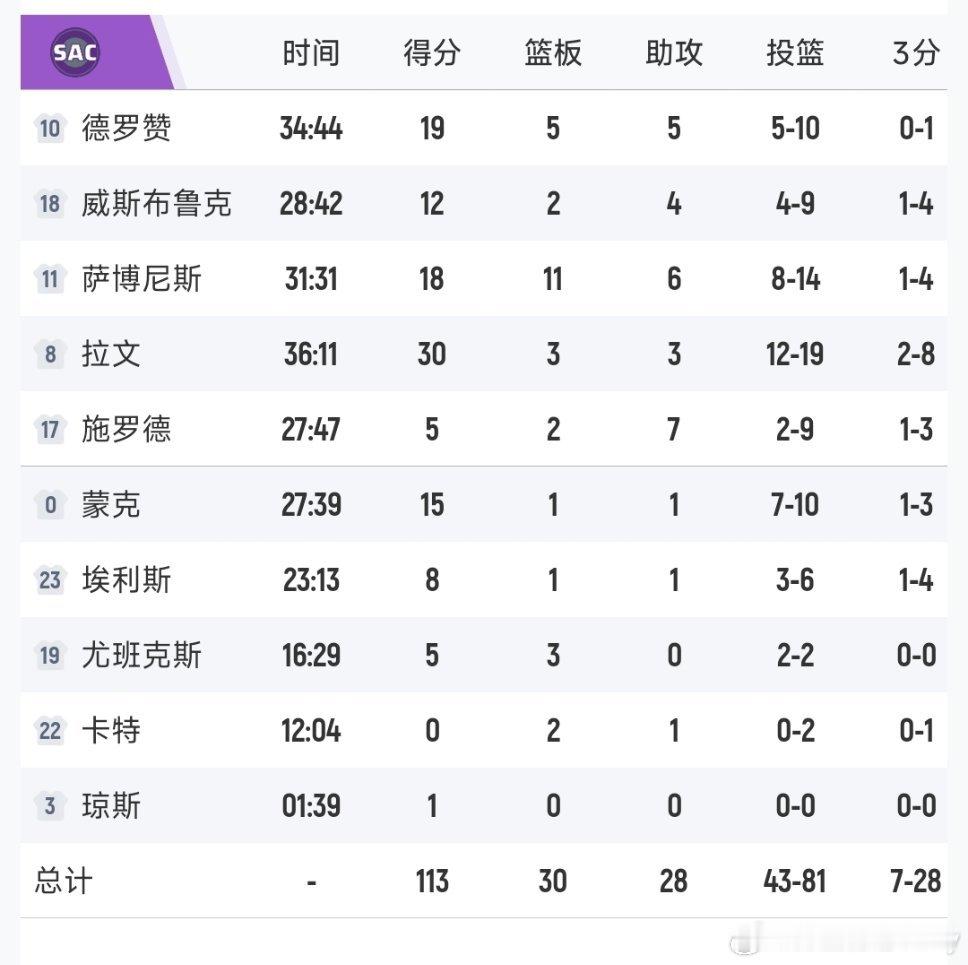 拉文30分,德罗赞19分,萨博尼斯18分11篮板6助攻,蒙克15分,威少12分。