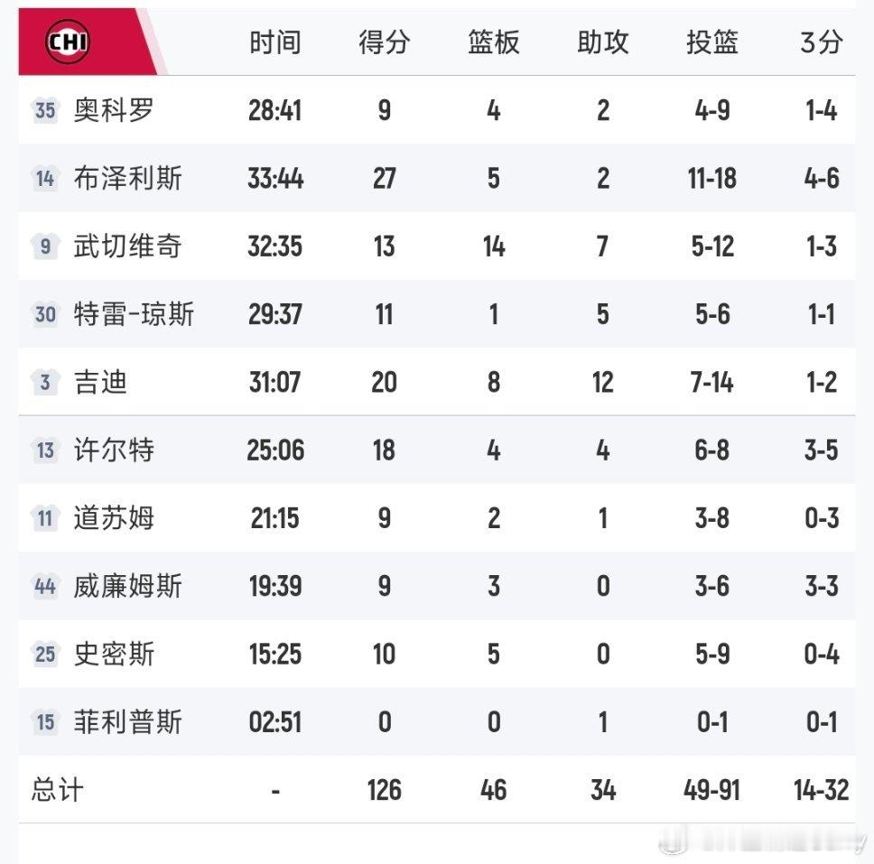 布泽利斯27分,吉迪20分8篮板12助攻,许尔特18分,武切维奇13分14篮板7助攻。
